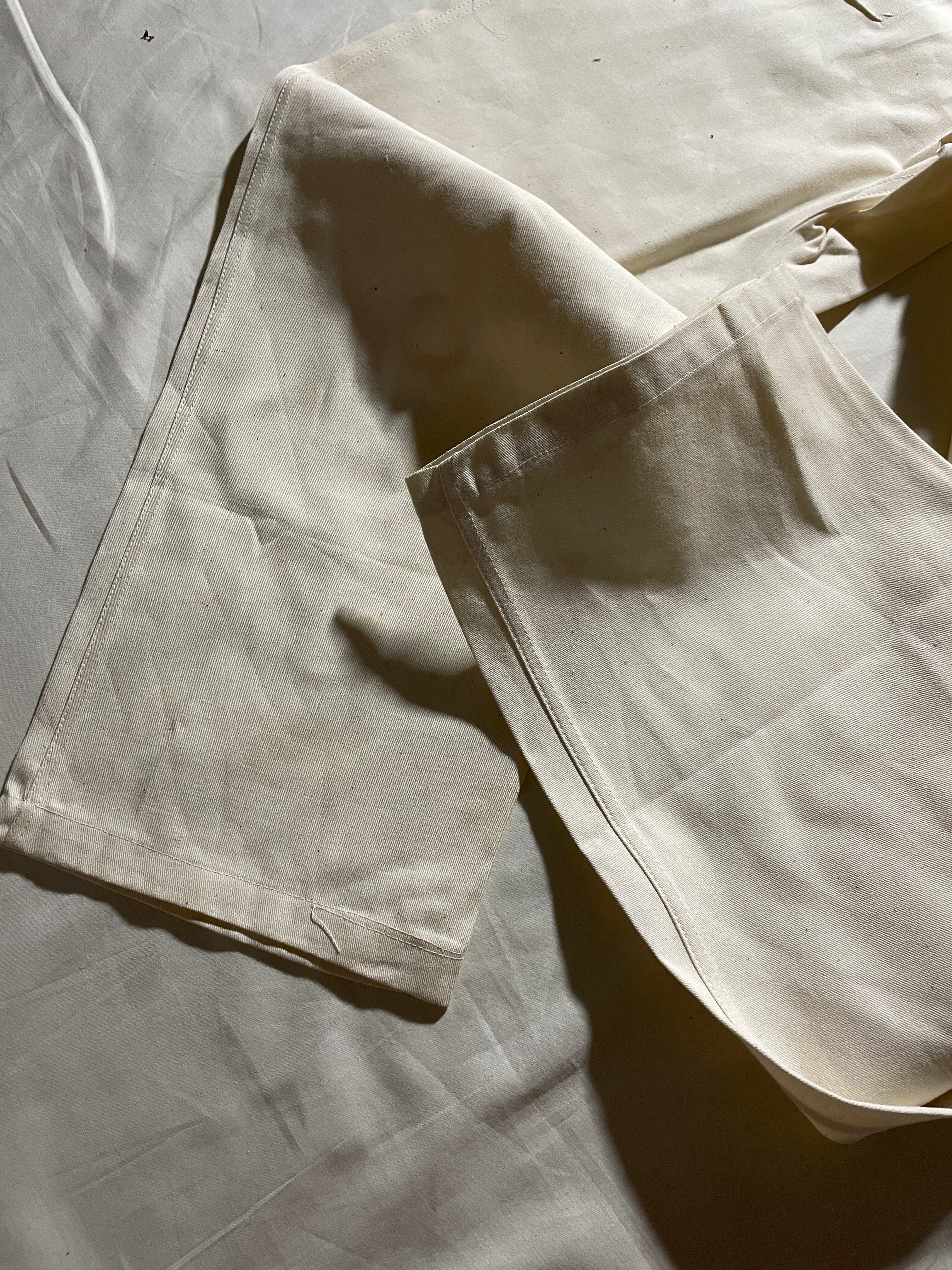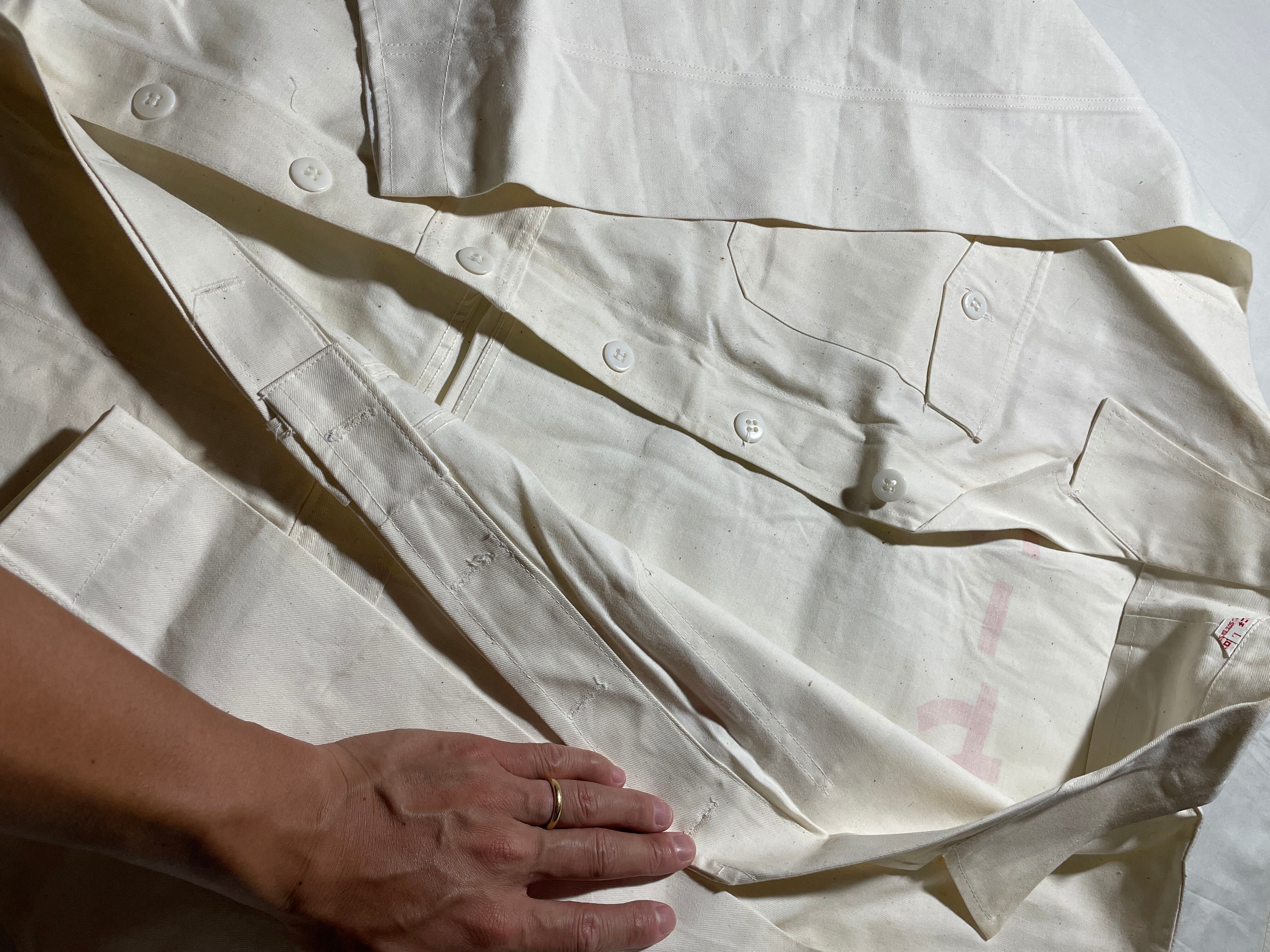 カラーは生成り。所々保管による汚れありますが洗濯で落ちると思います。一度も水に通していないデッドストック。