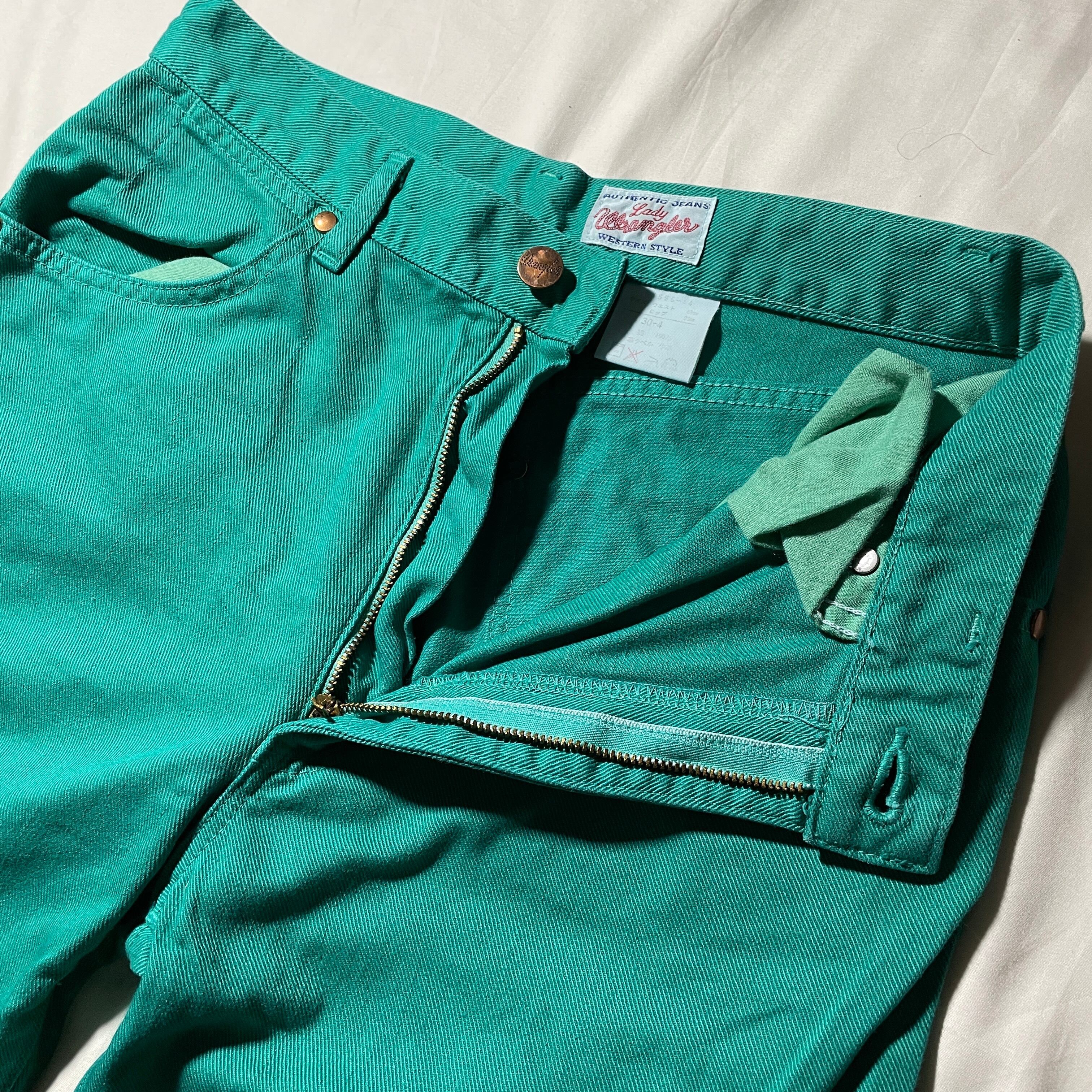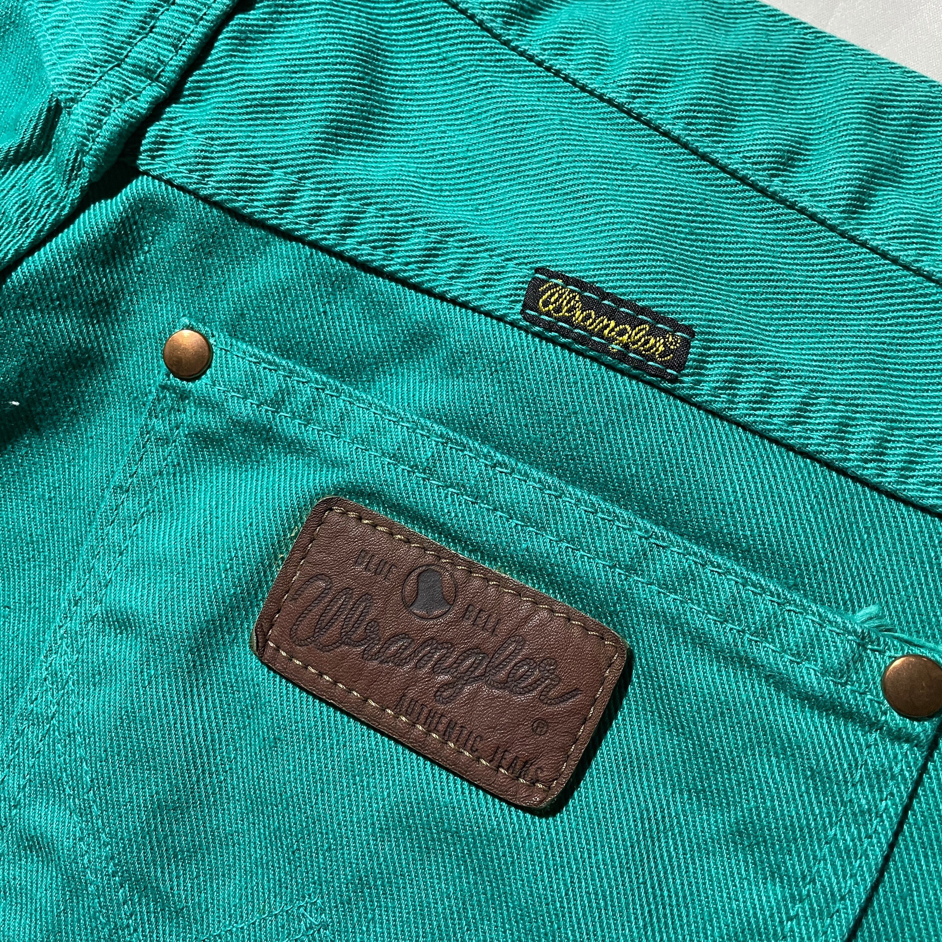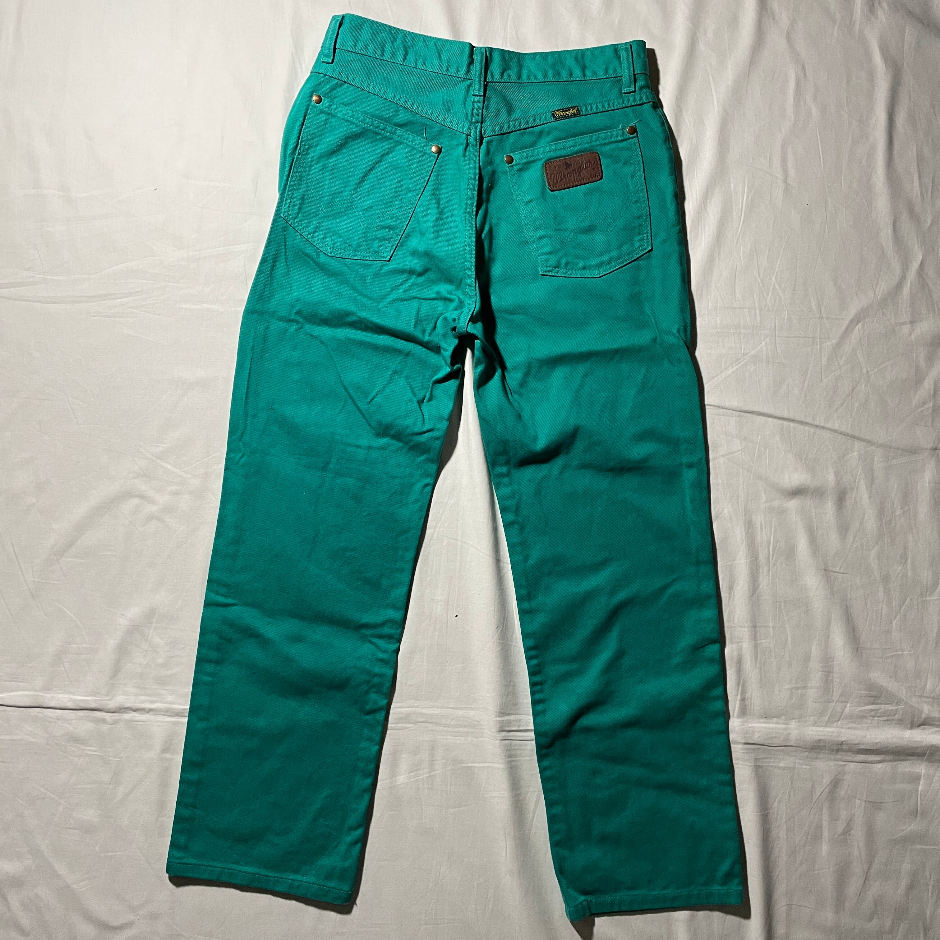 90s頃のヴィンテージWRANGLER。13MWZのシルエットそのままにエメラルドグリーンに染め上げた一着になっています。