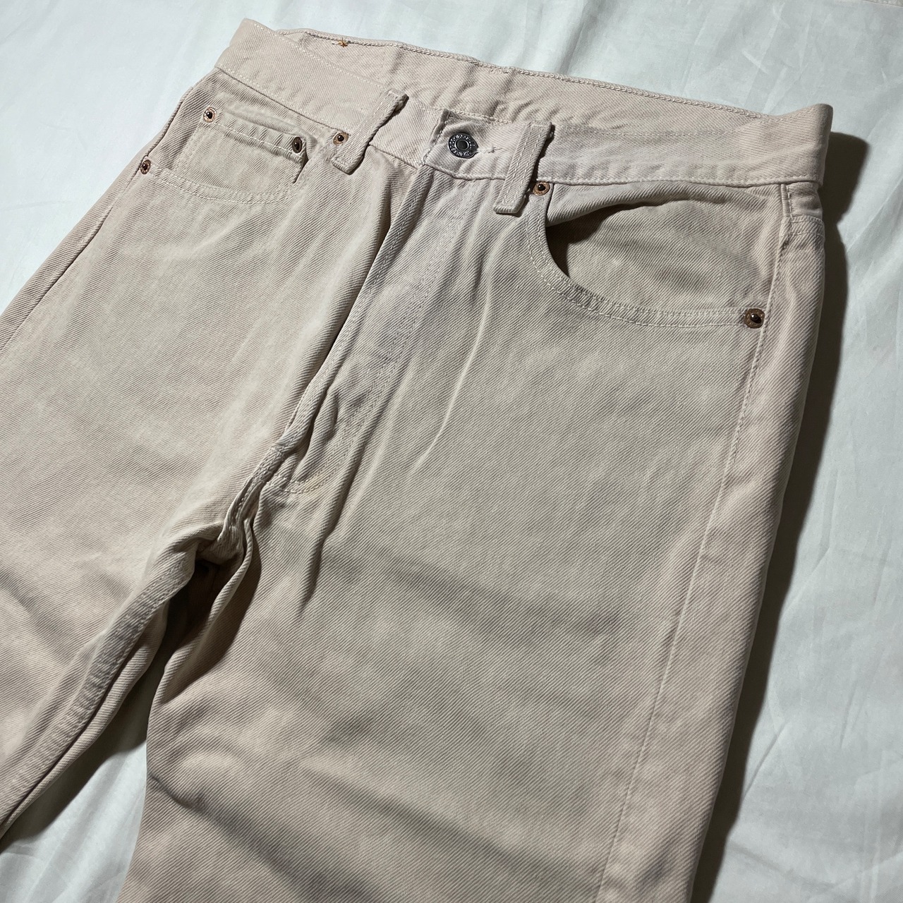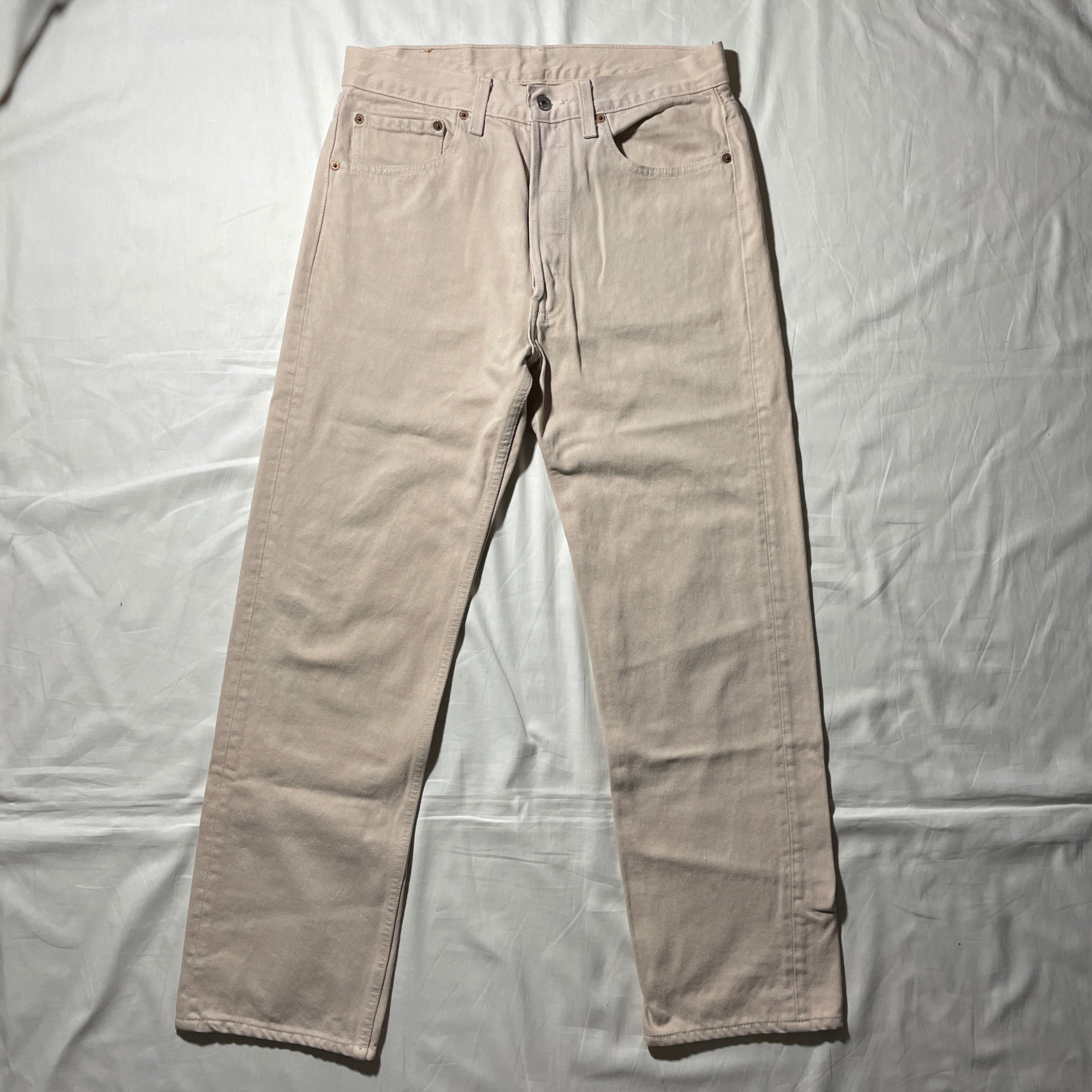93sのLevi’s501。ボタンフライの定番モデル。珍しいカラーリングで生成りにややピンクが入ったような色味。落ち着いた色合いてトップス選ばず合わせやすいかと思います。