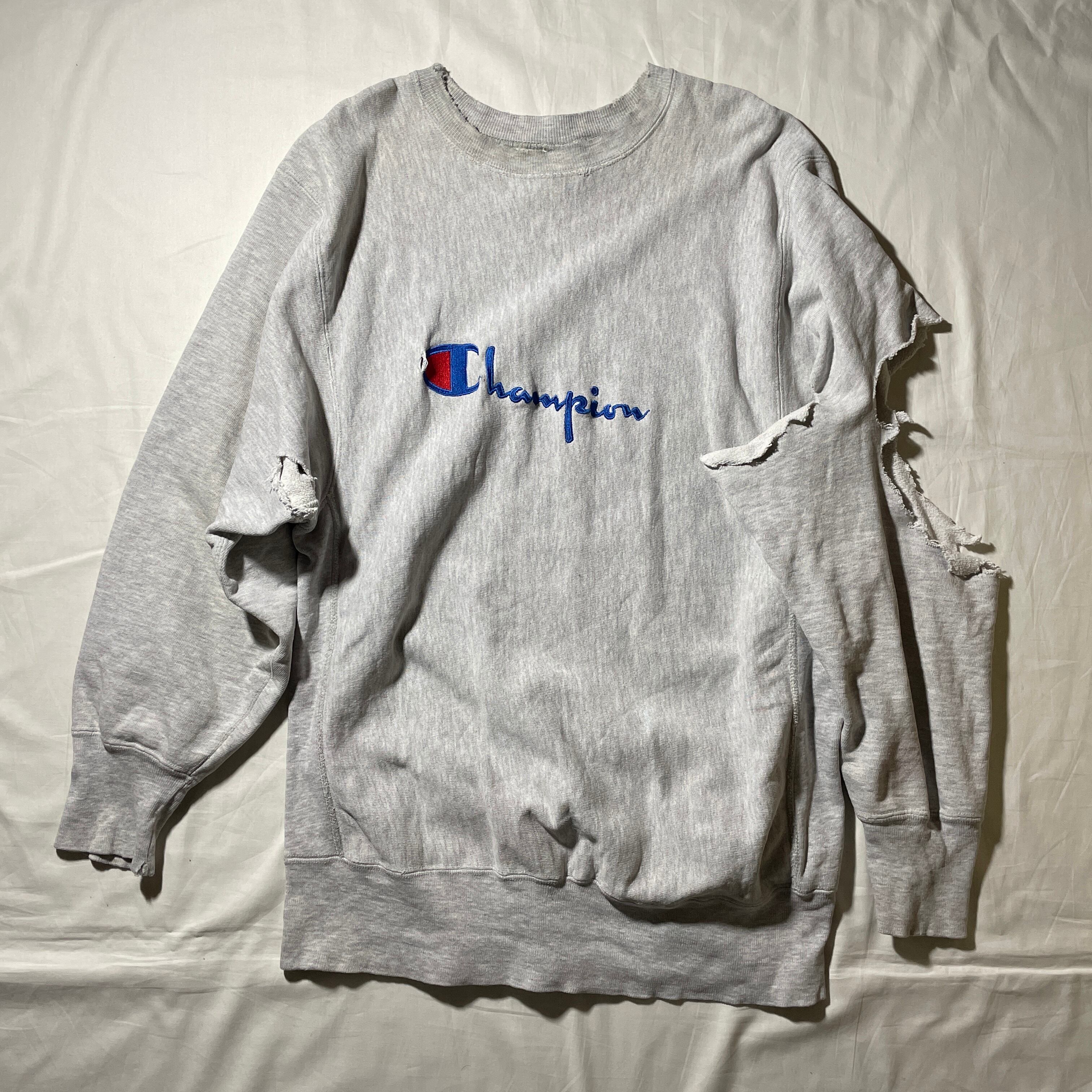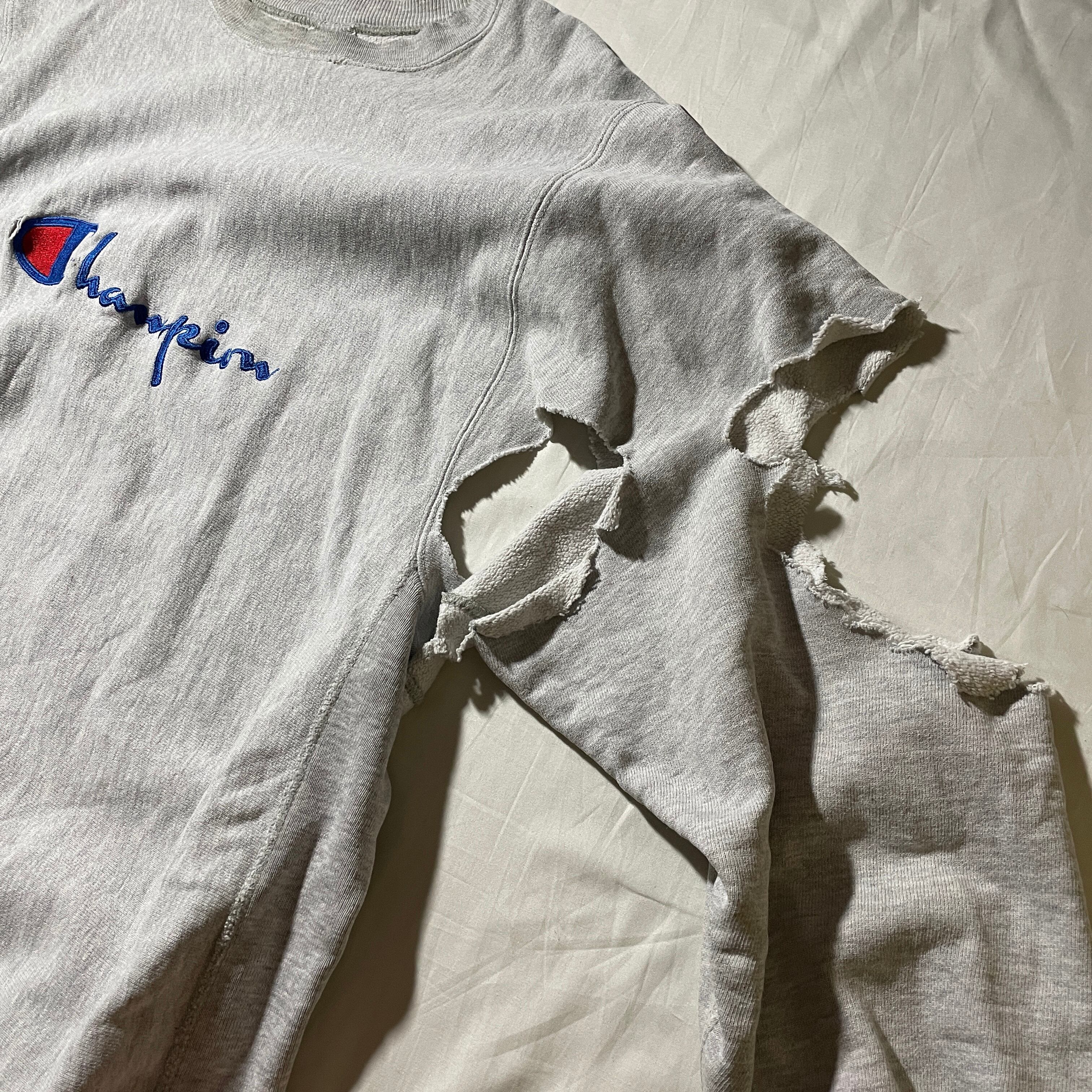 90s頃のリバースウィーブ。片腕爆発の超グランジ感です。生地自体が弱くなっているわけではないので着用して破れるということはありません。