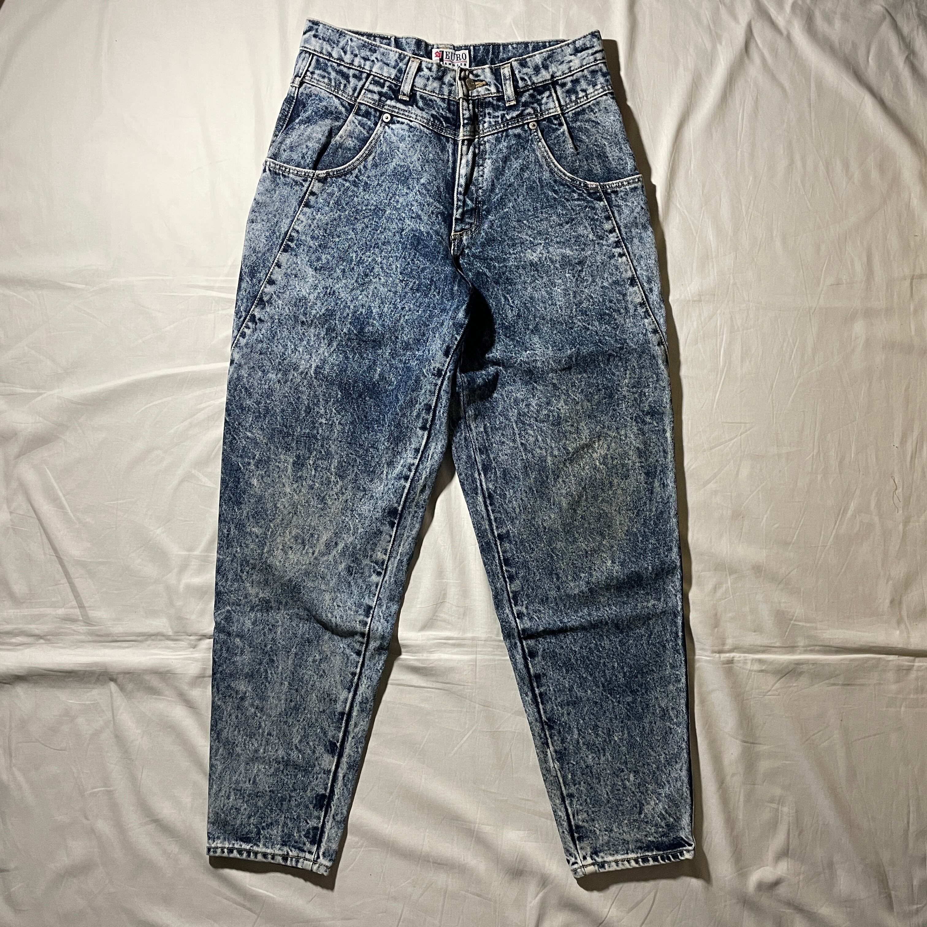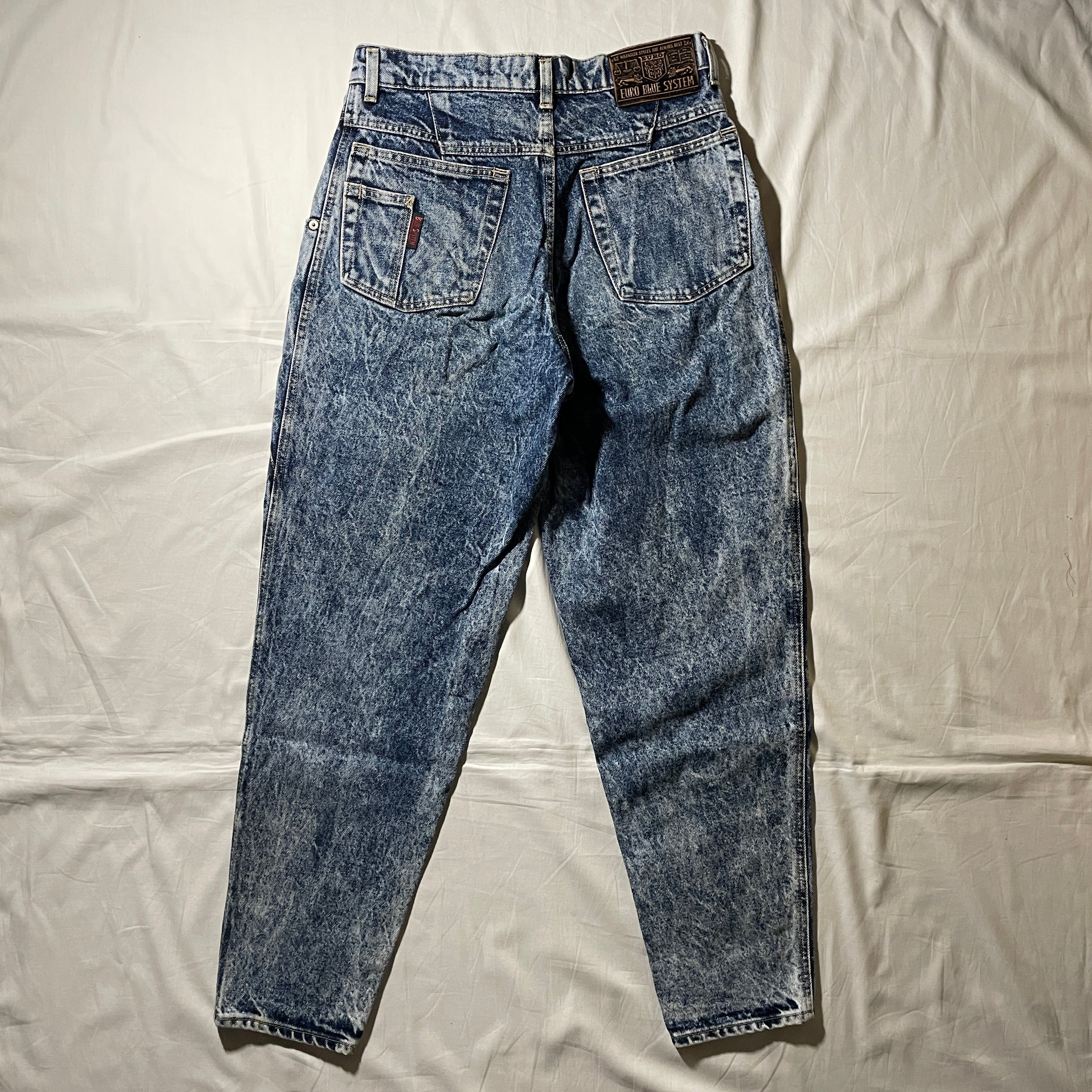 80s頃のwrangler。EURO BLUE SYSTEMというラインでユーロスタイルを取り入れた一着になってます。当時80s頃の日本で流行ったケミカルウォッシュにきつめのテーパーがかかったバルーンのようなシルエット。