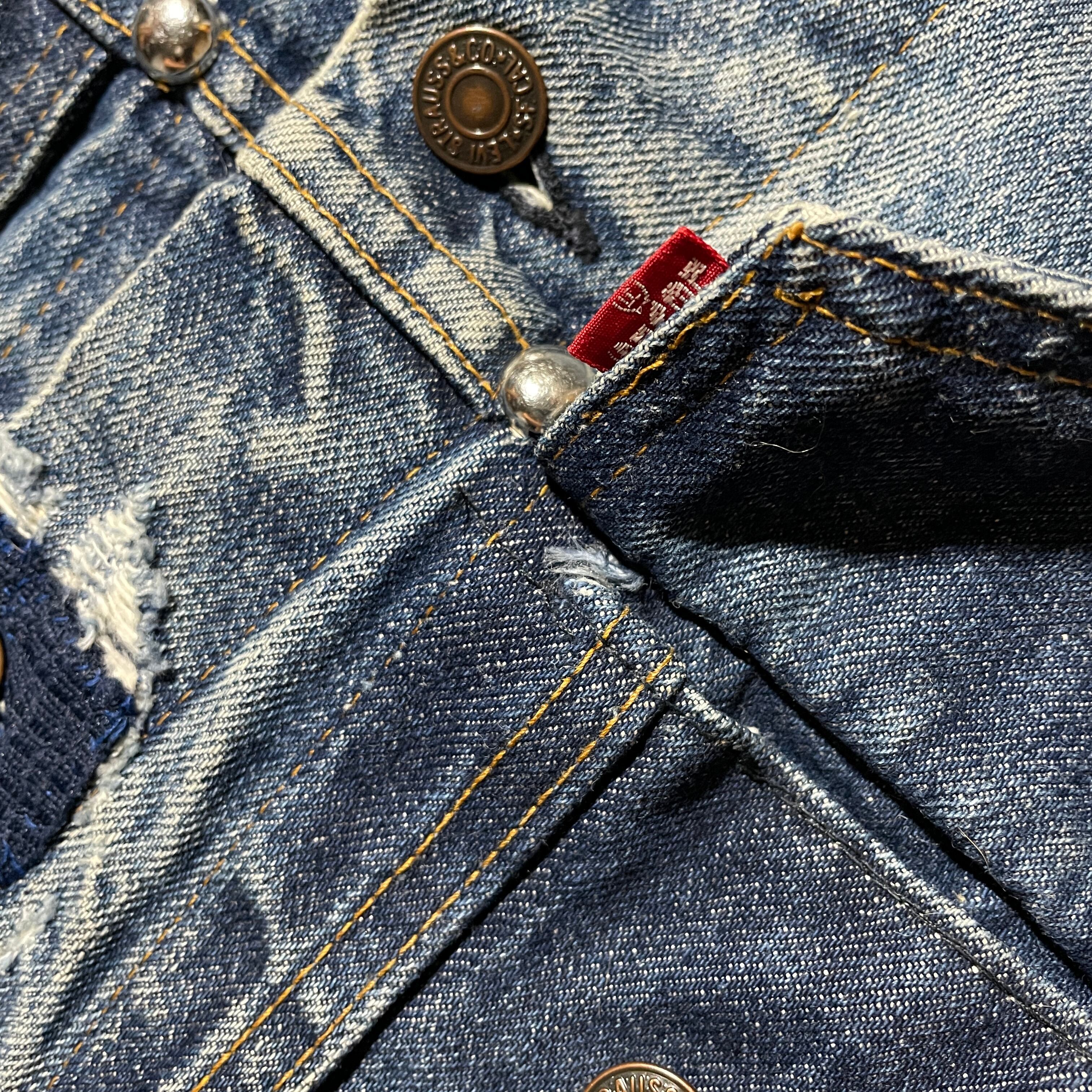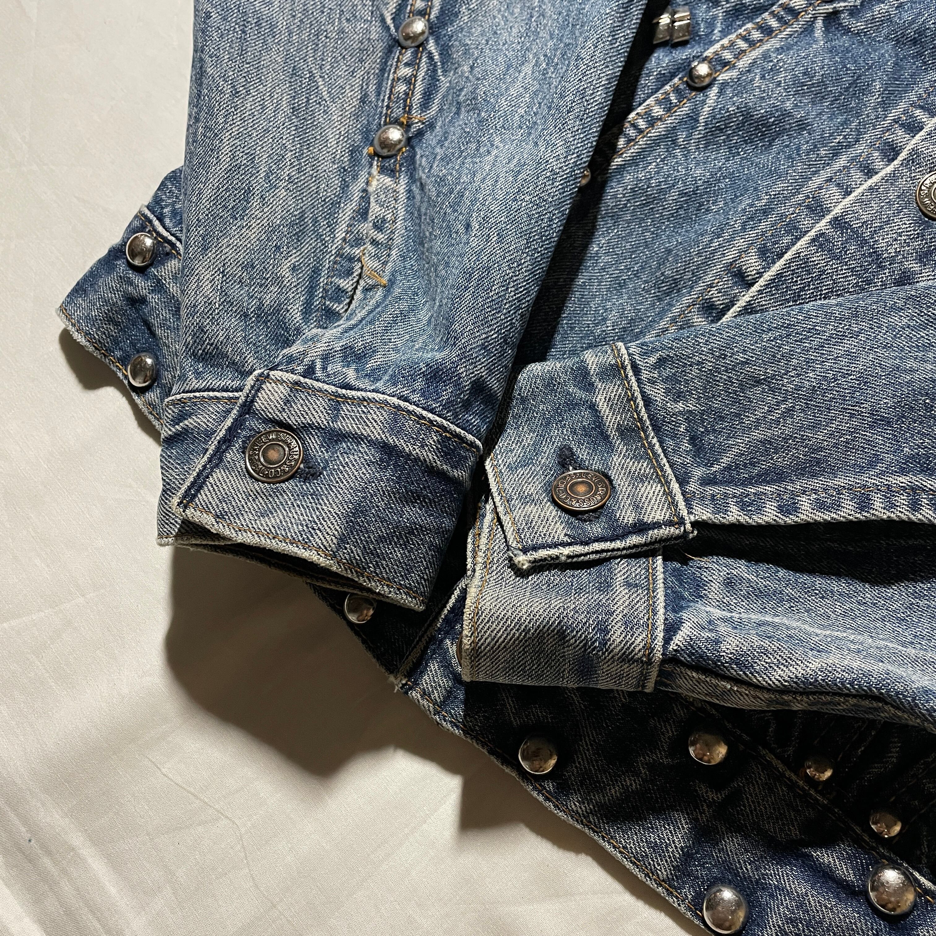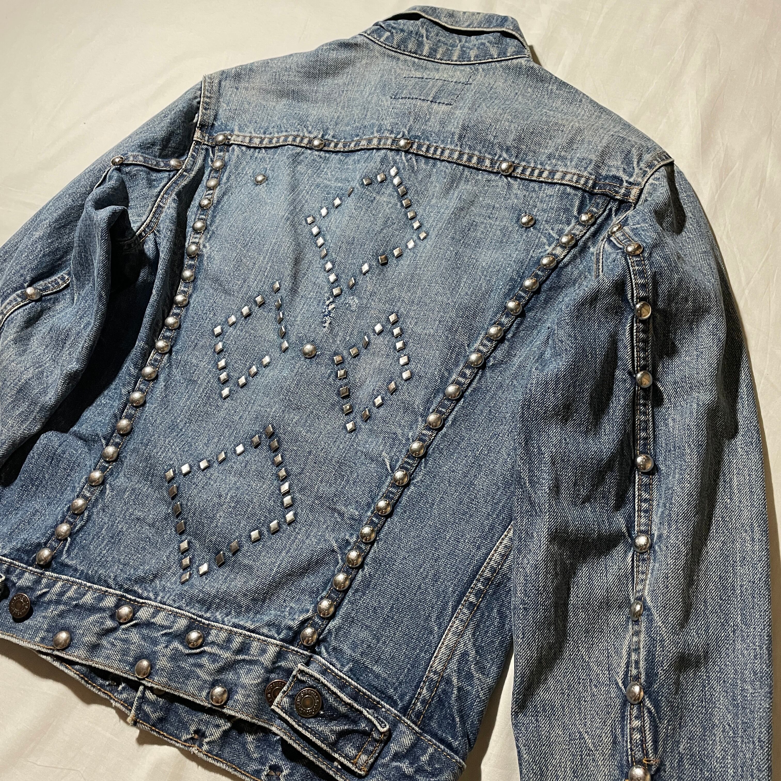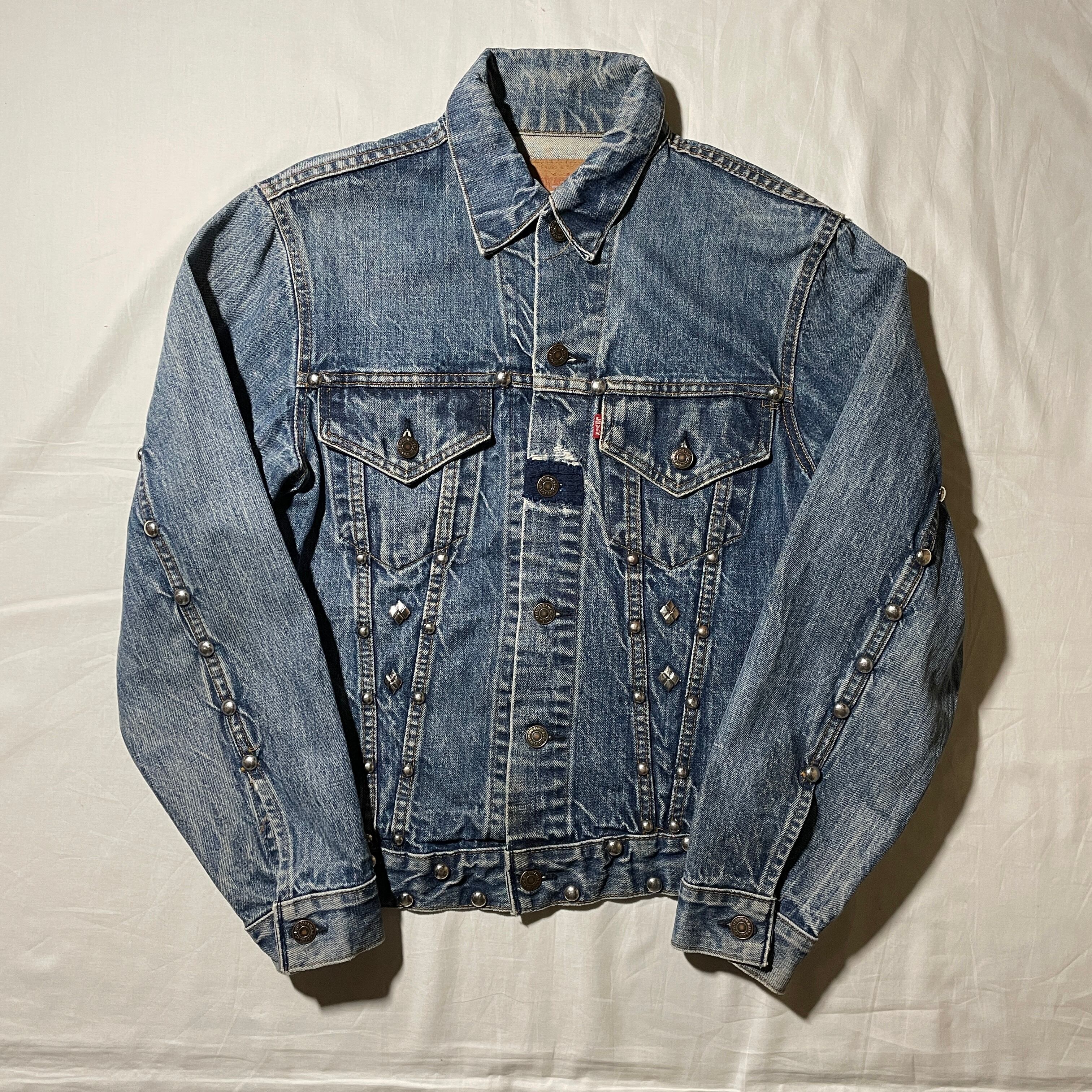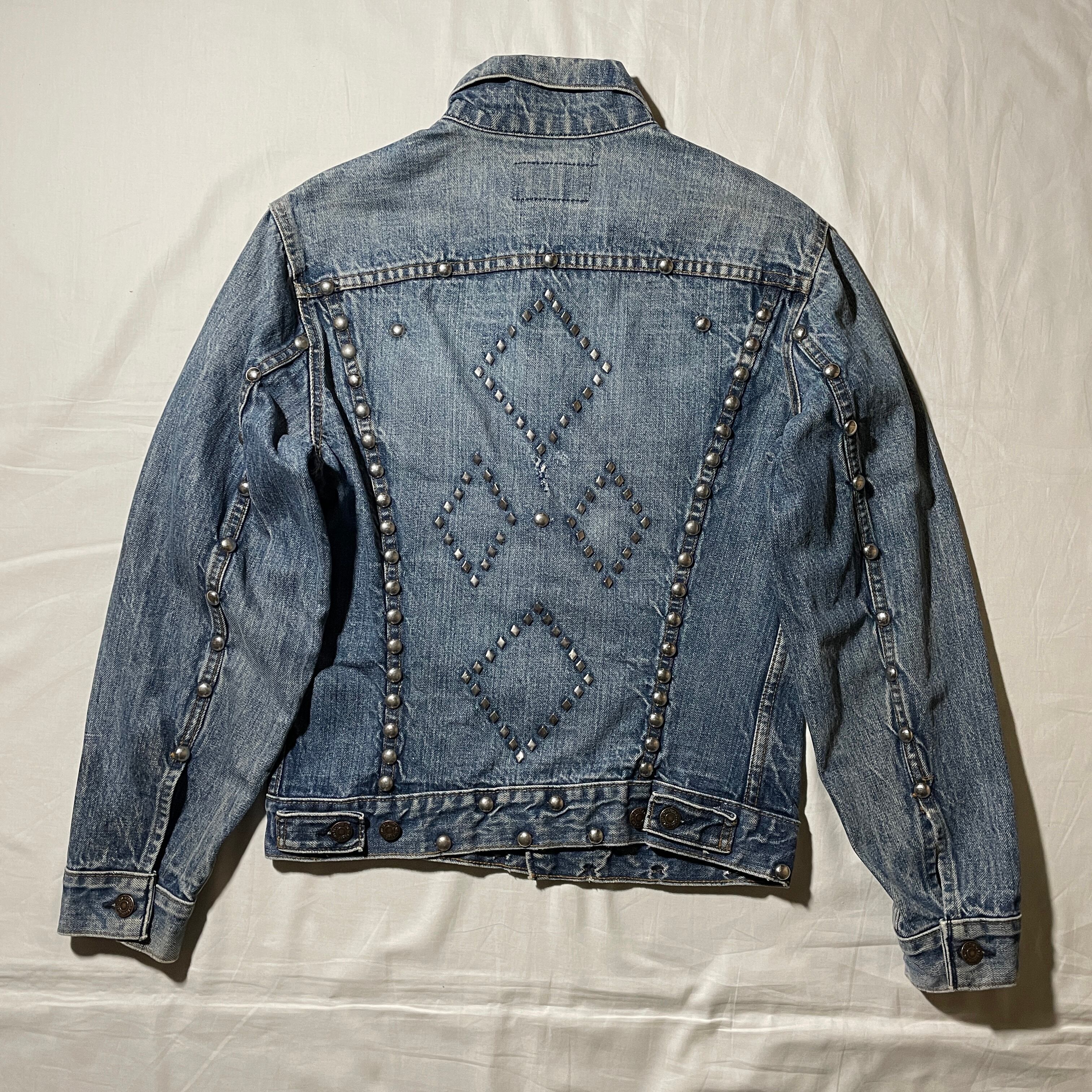 前オーナーのカスタムで全体にスタッズの施されたロックな一着になってます。色の落ち方は70s初期あたりの505や517なんかで見られる綺麗な縦落ちです。