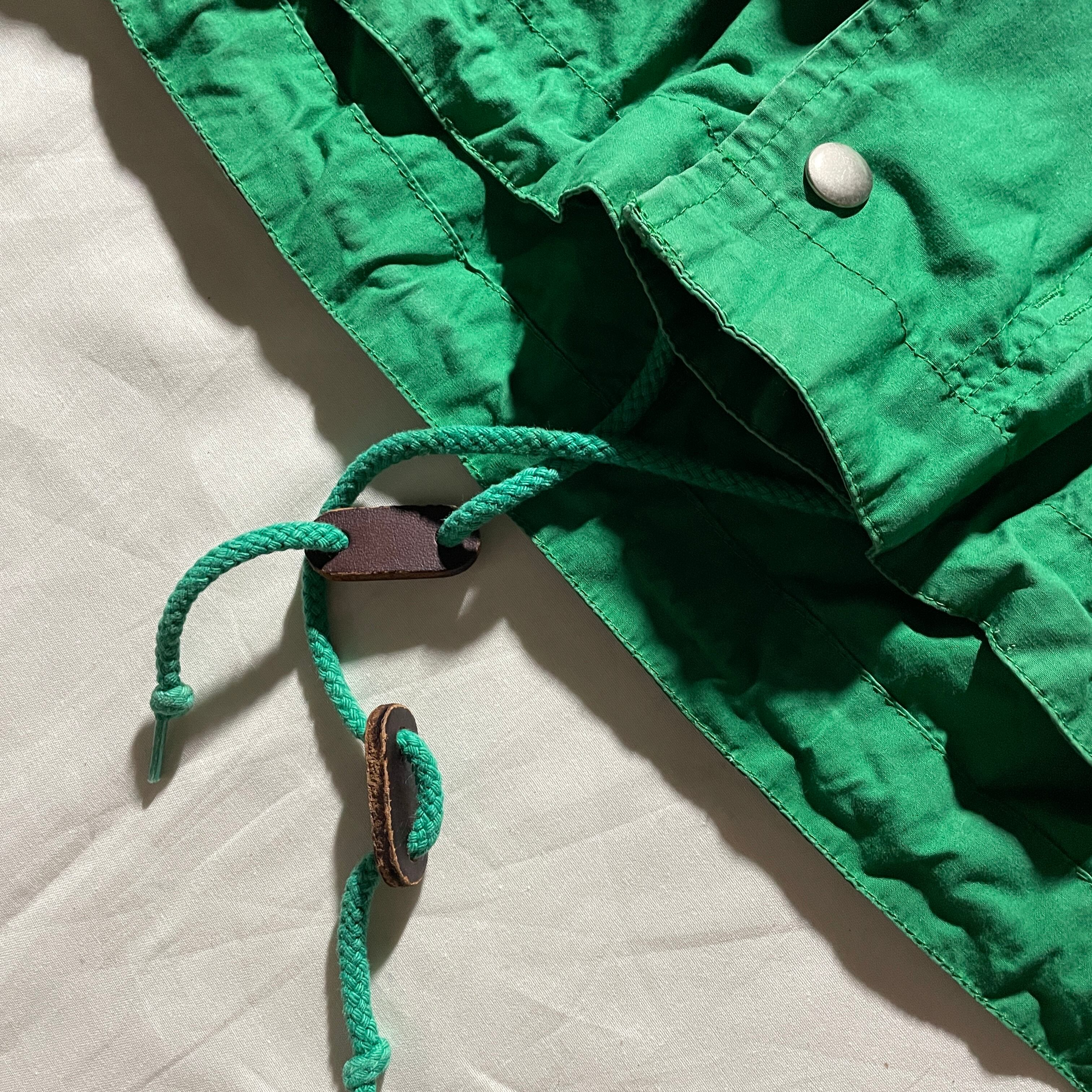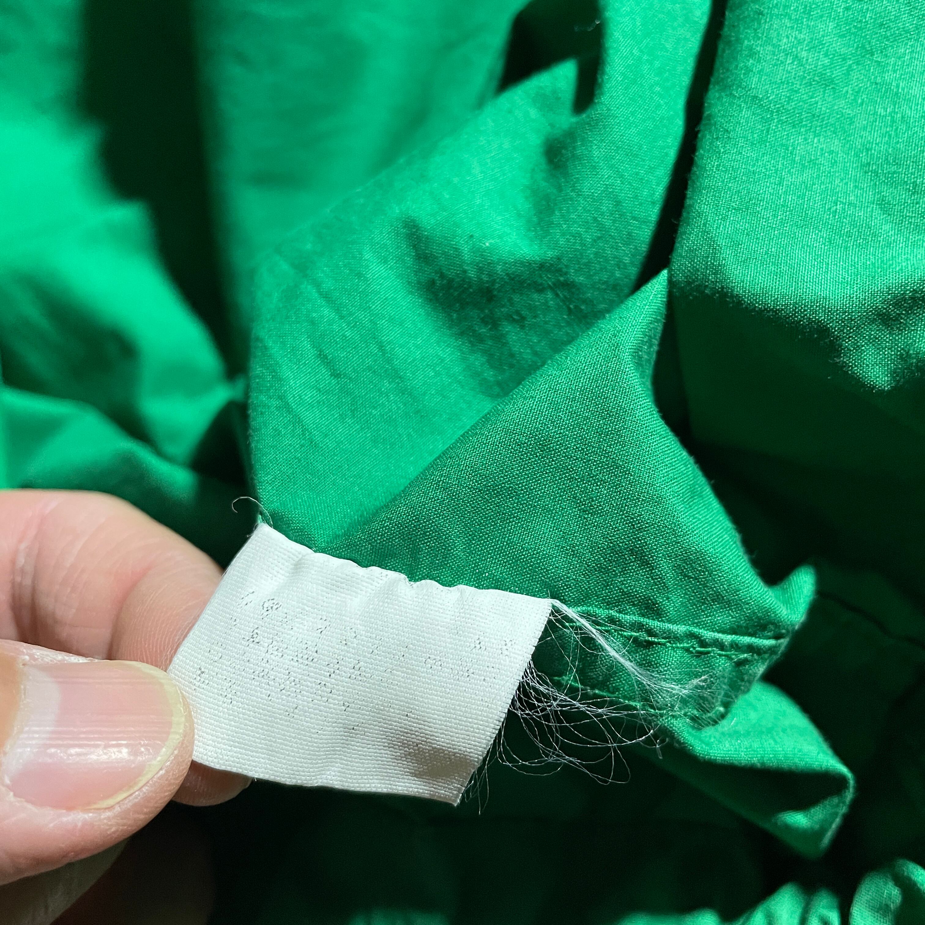 Lサイズで大きめにゆったり羽織るのが今っぽいんではないでしょうか。ビビットなグリーンカラーもアクセントになってgoodです。