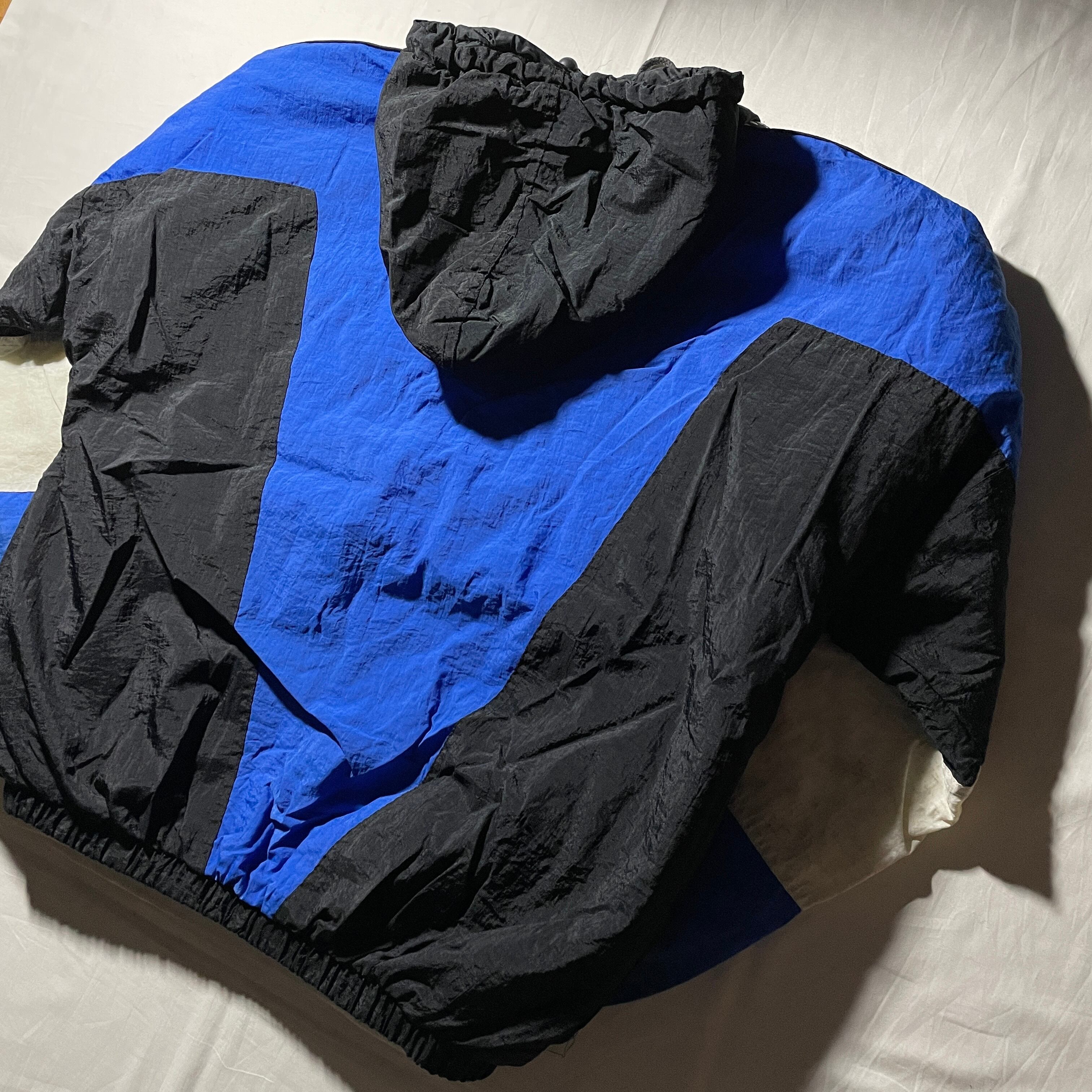 NIKEのウーブンジャケットのようなシワ感のあるナイロン地。フルジップでフード付きなのでバランスとりやすいと思います。