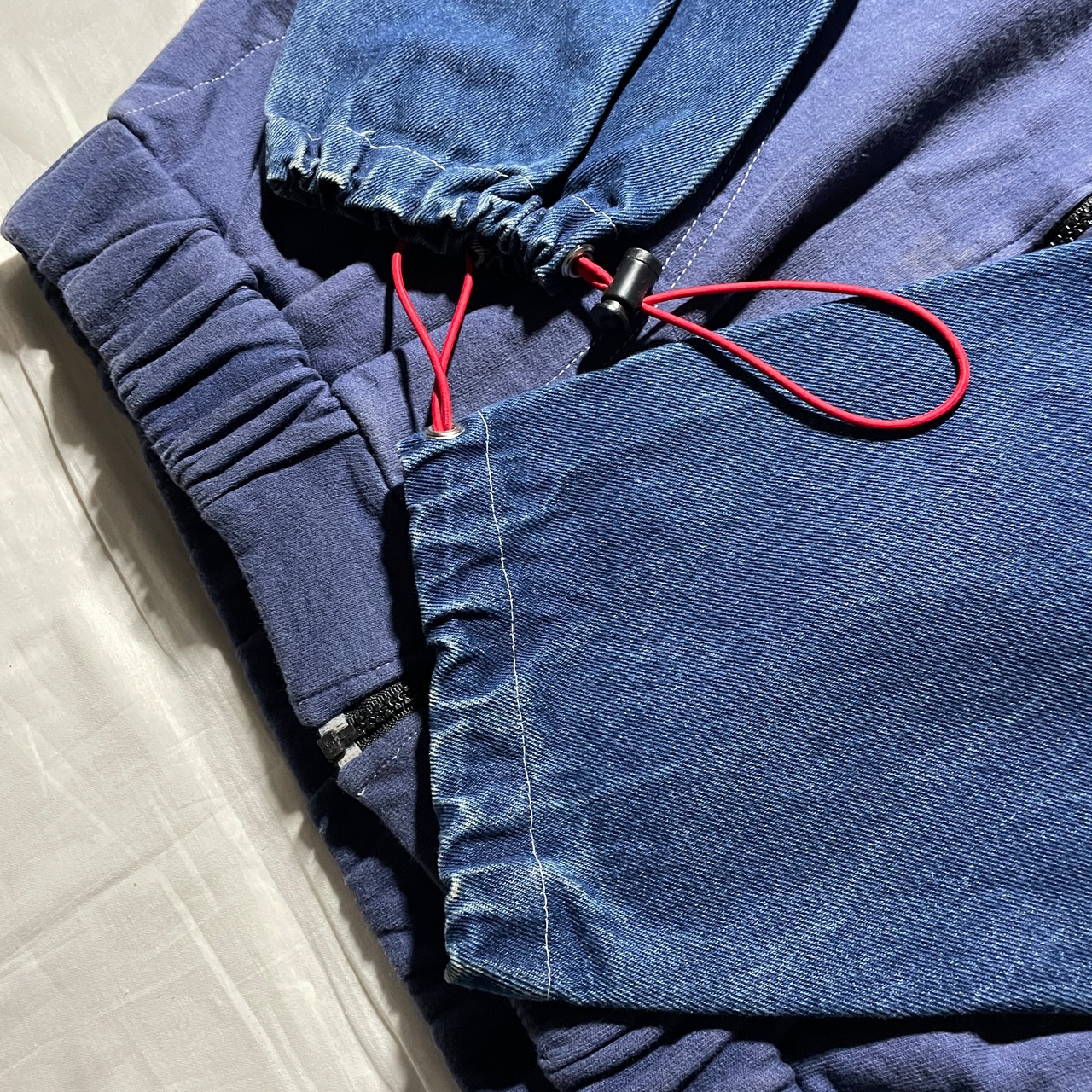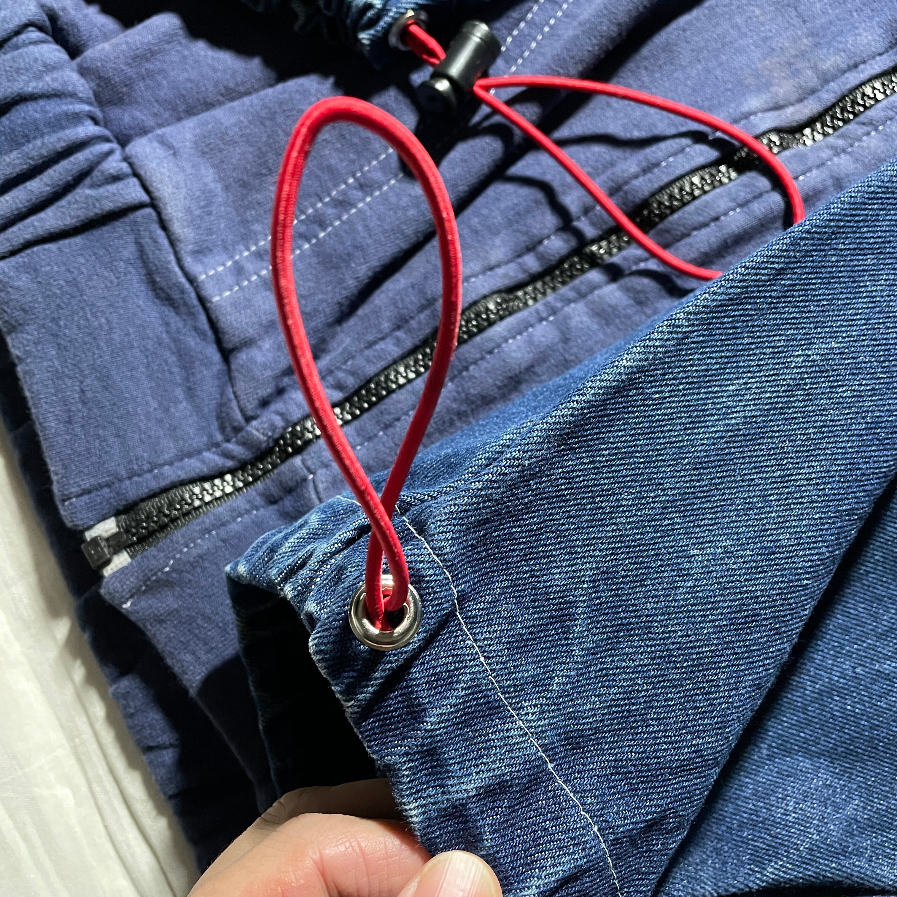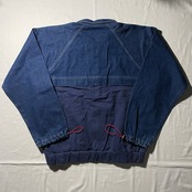 デニム地とスウェット地が切り替えしになっている珍しいデザイン。袖口はドローコードで調整可能。コードのカラーだけ赤になっているところも粋なデザインです。
