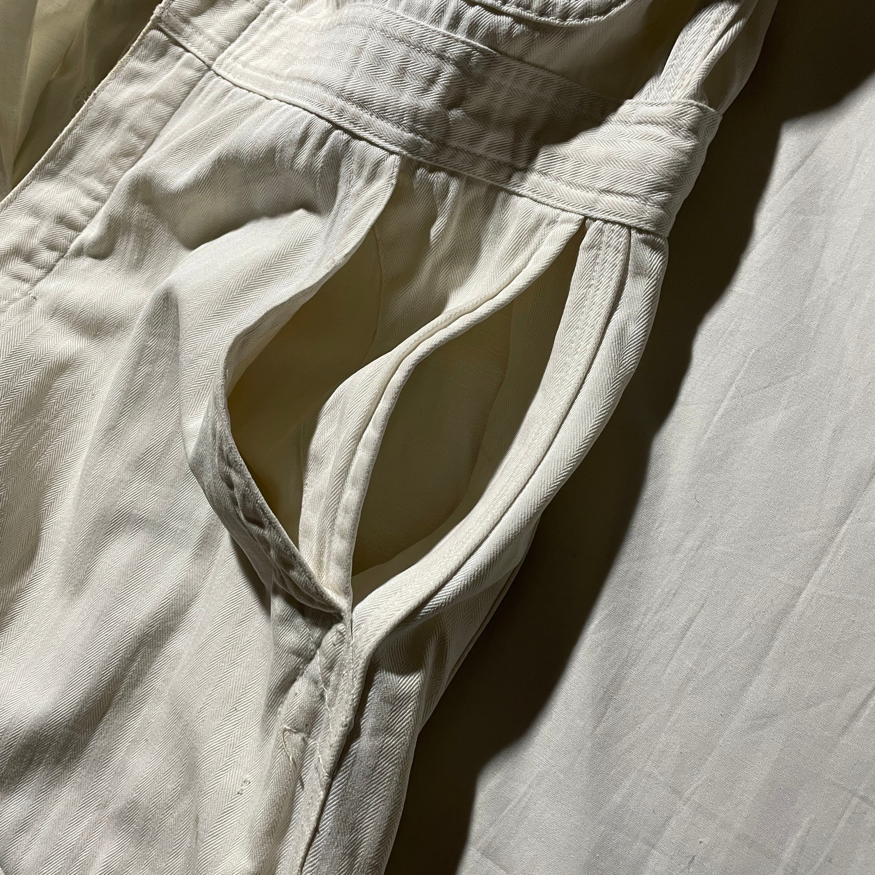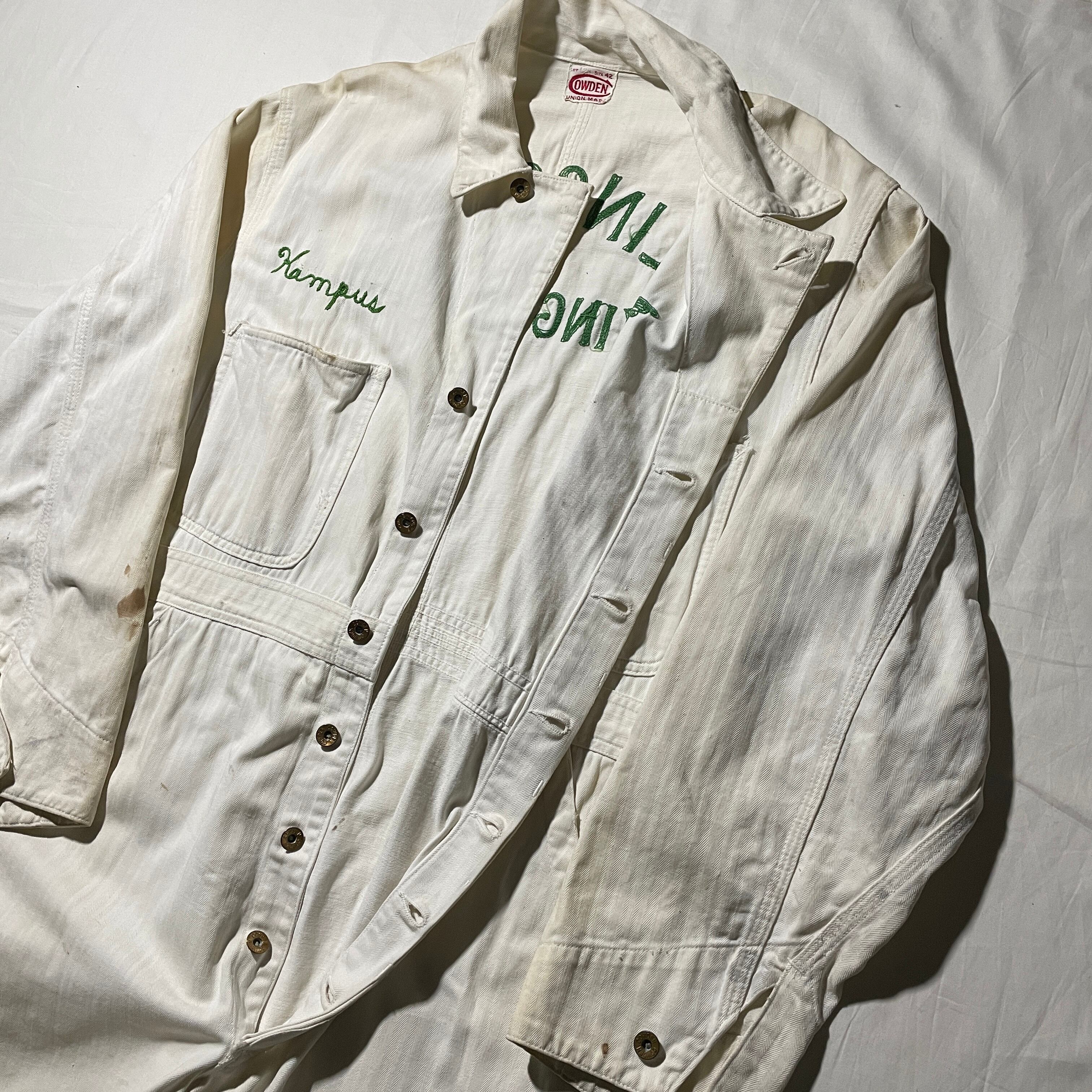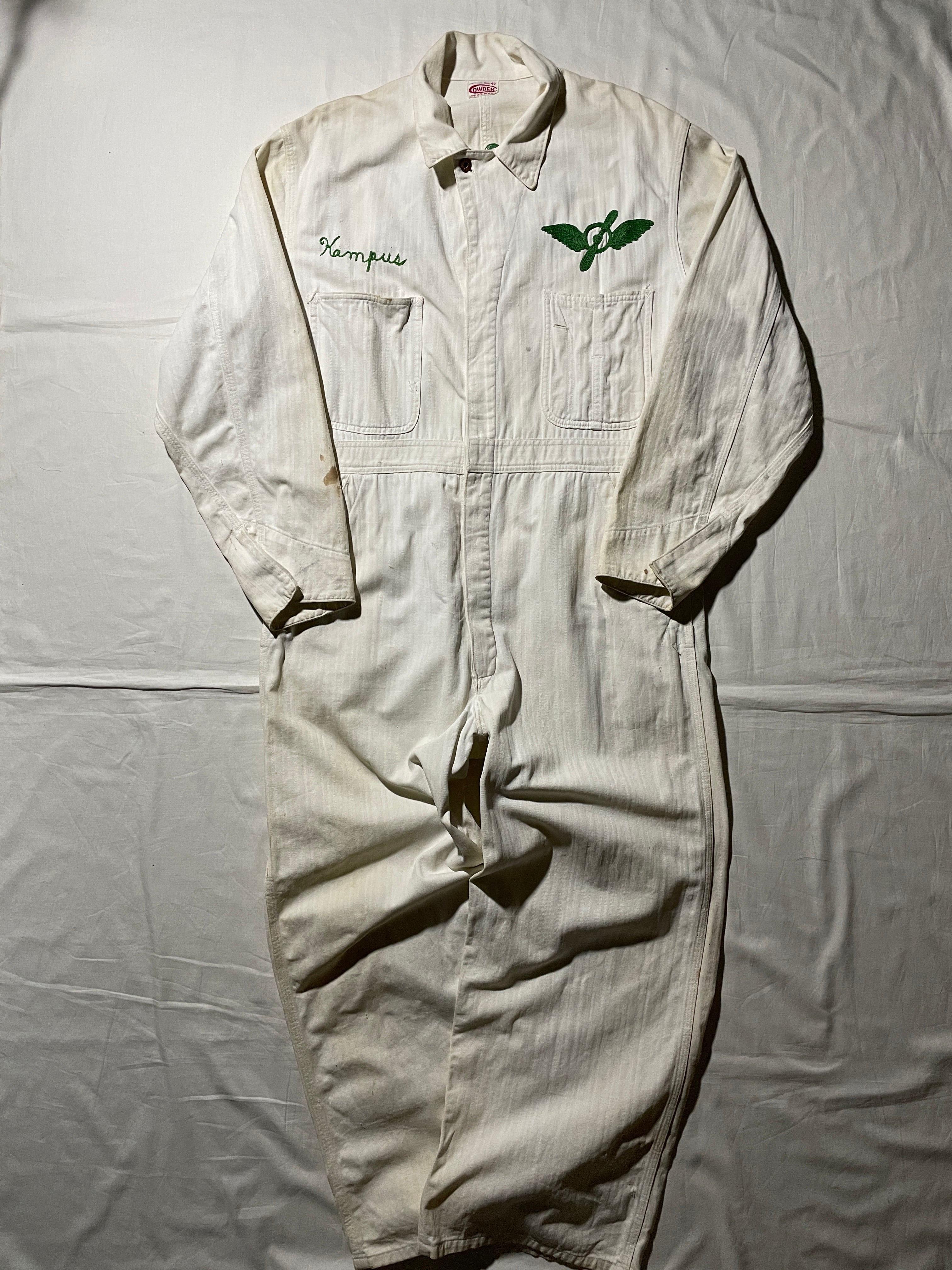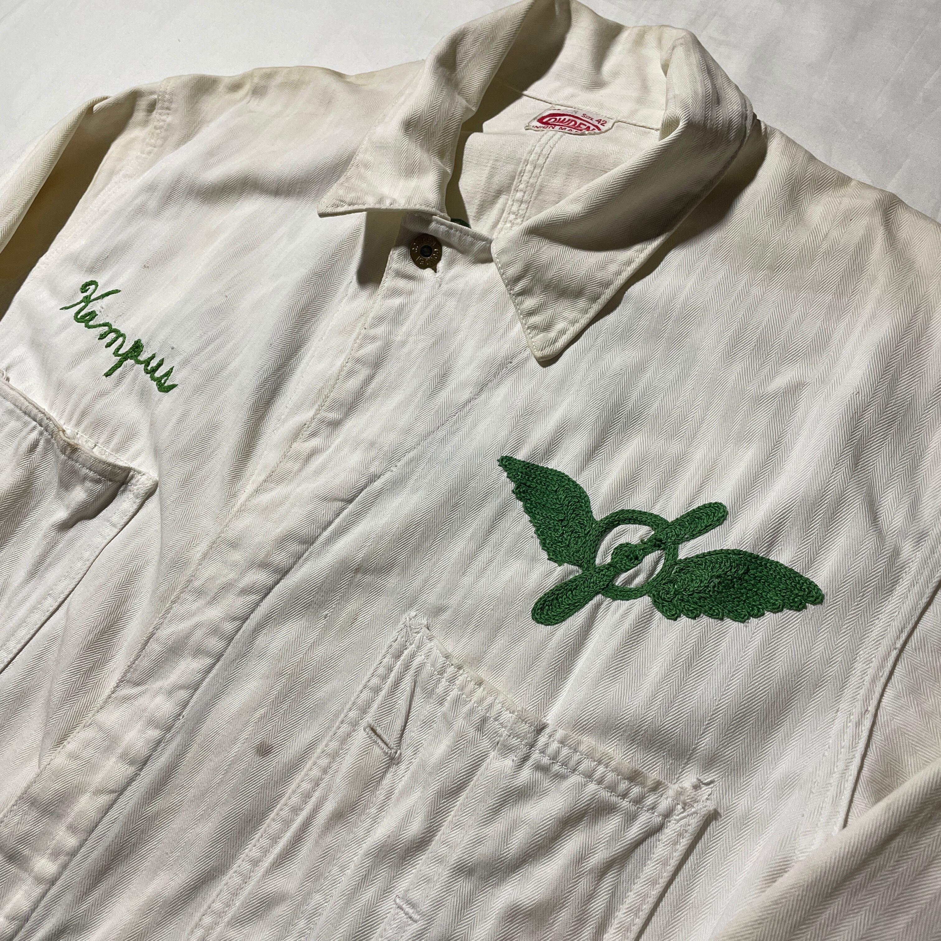 こちらは40s後期-50sにかけてくらいのヘリンボーンツイルを使用したオールインワン。フロント、バックにチェーンステッチで刺繍が入ります。リンカーンにあった飛行訓練の学校で使用されていたもので胸に入るデザインも非常に粋です。