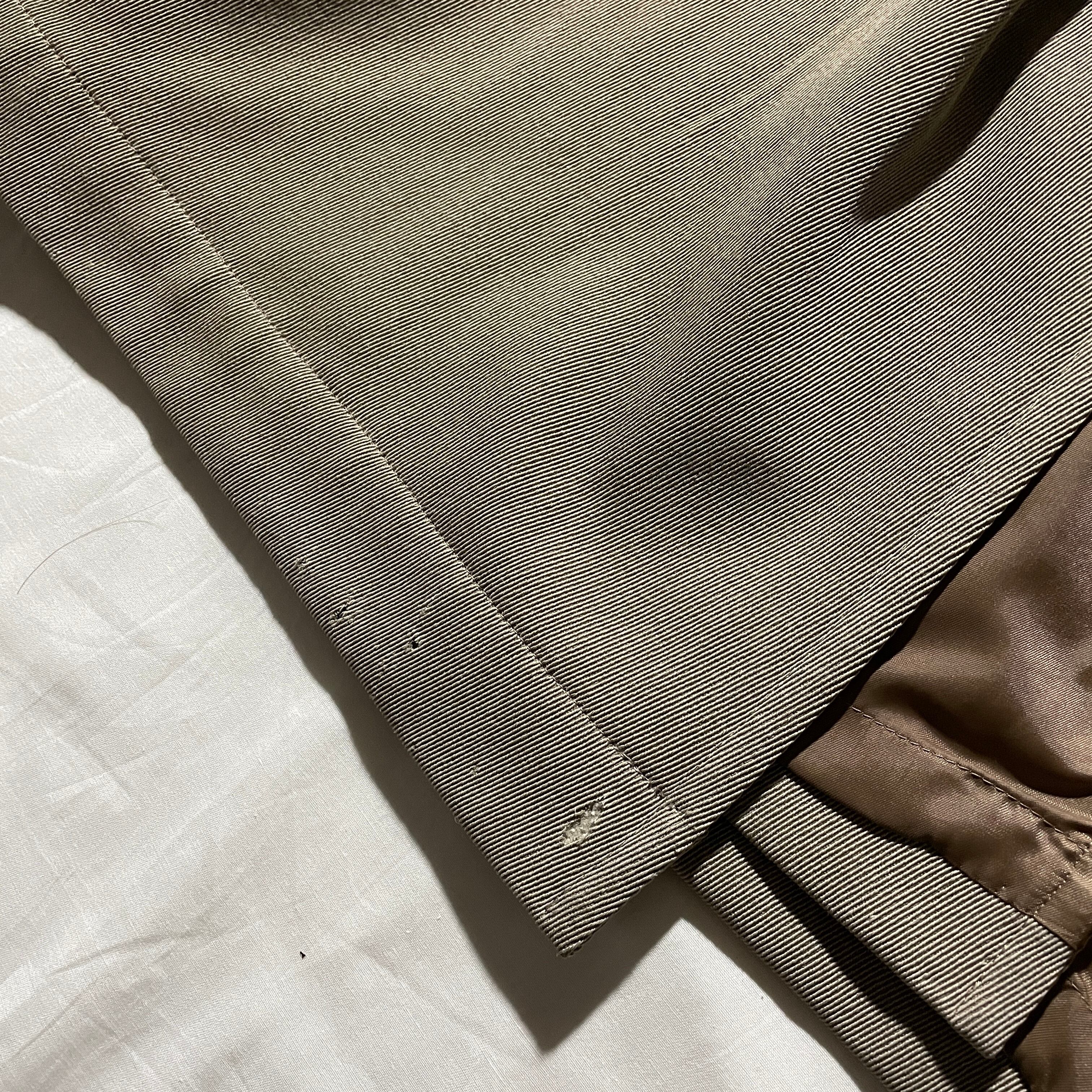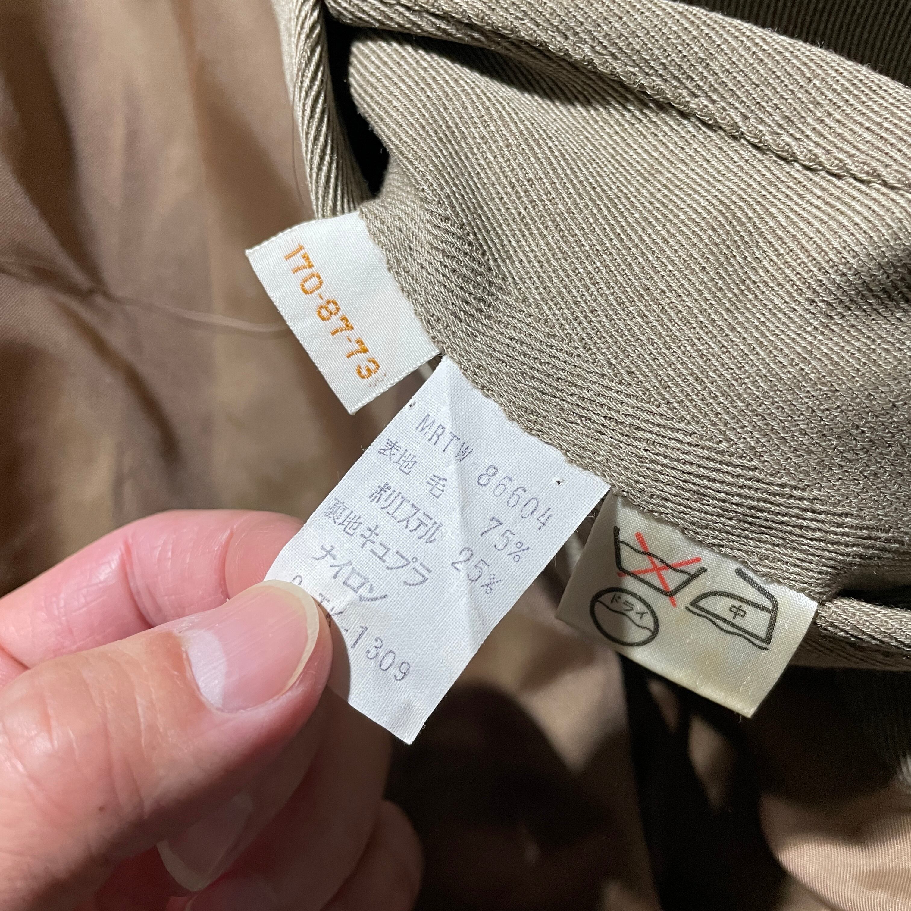 ウールギャバジンのような密度の高い生地を使用、袖、腰のストラップの留め具にはリアルレザーが使われています。クオリティは申し分無しかと。