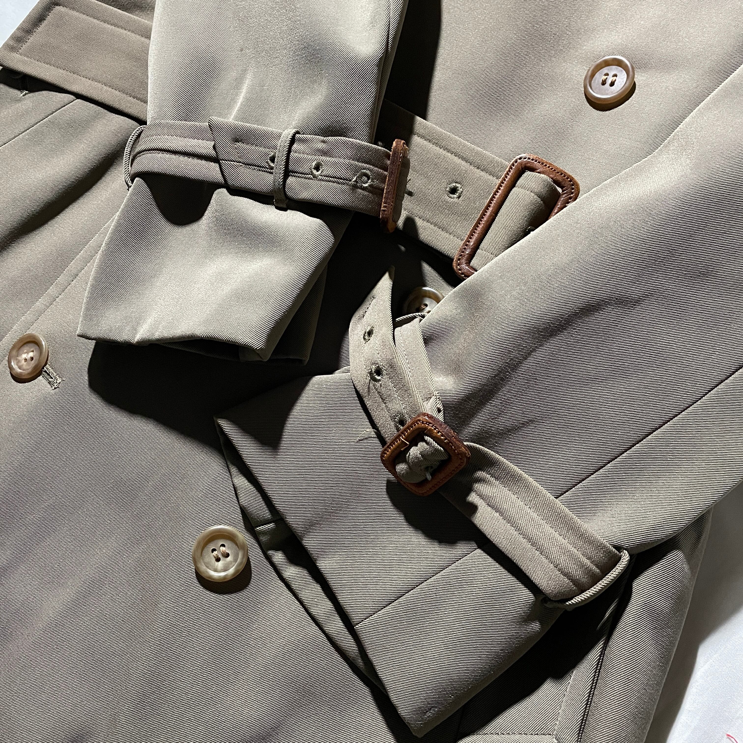 密度の高いウールギャバジン生地を使用。袖、腰のストラップの留め具にはリアルレザーが使われています。クオリティは申し分無しかと。