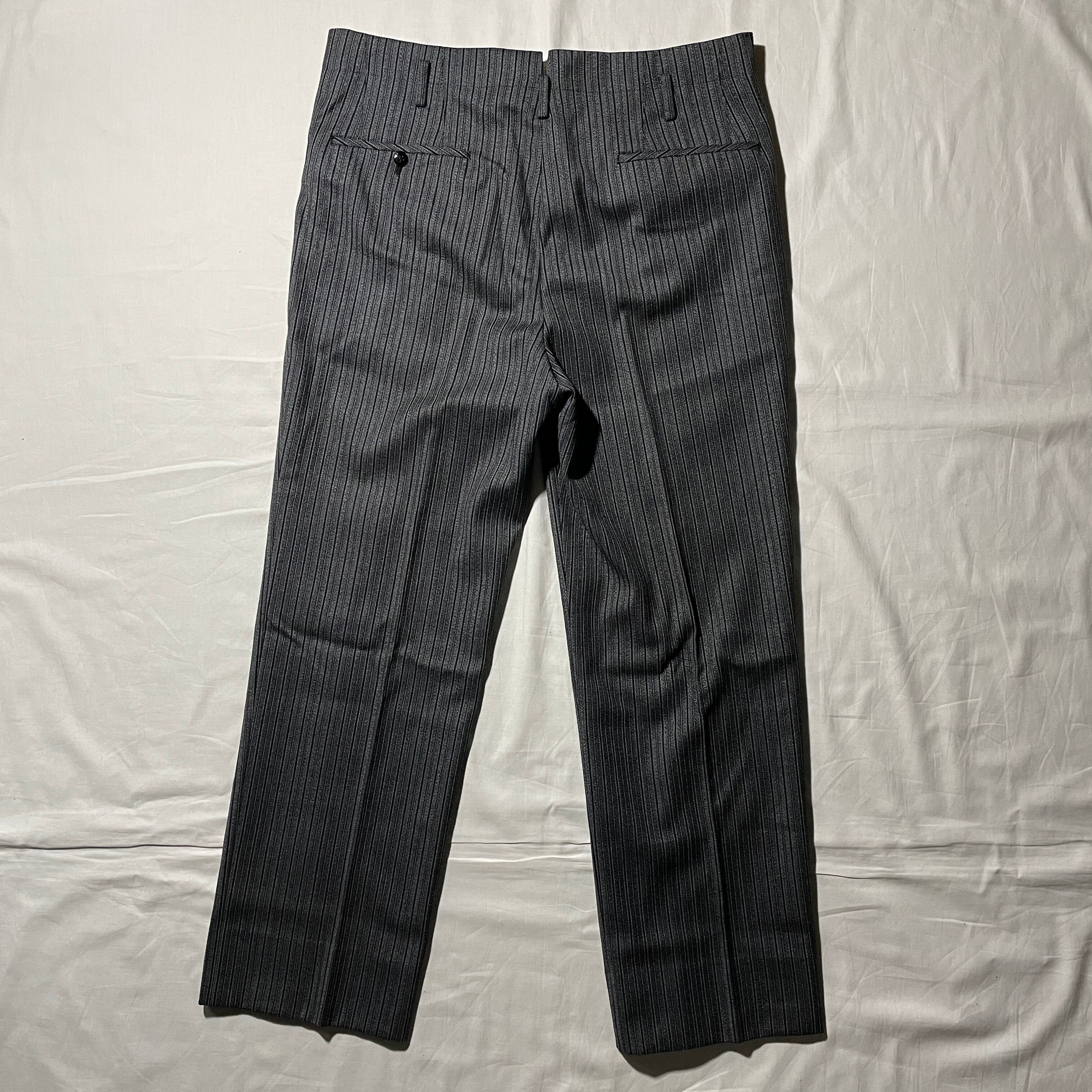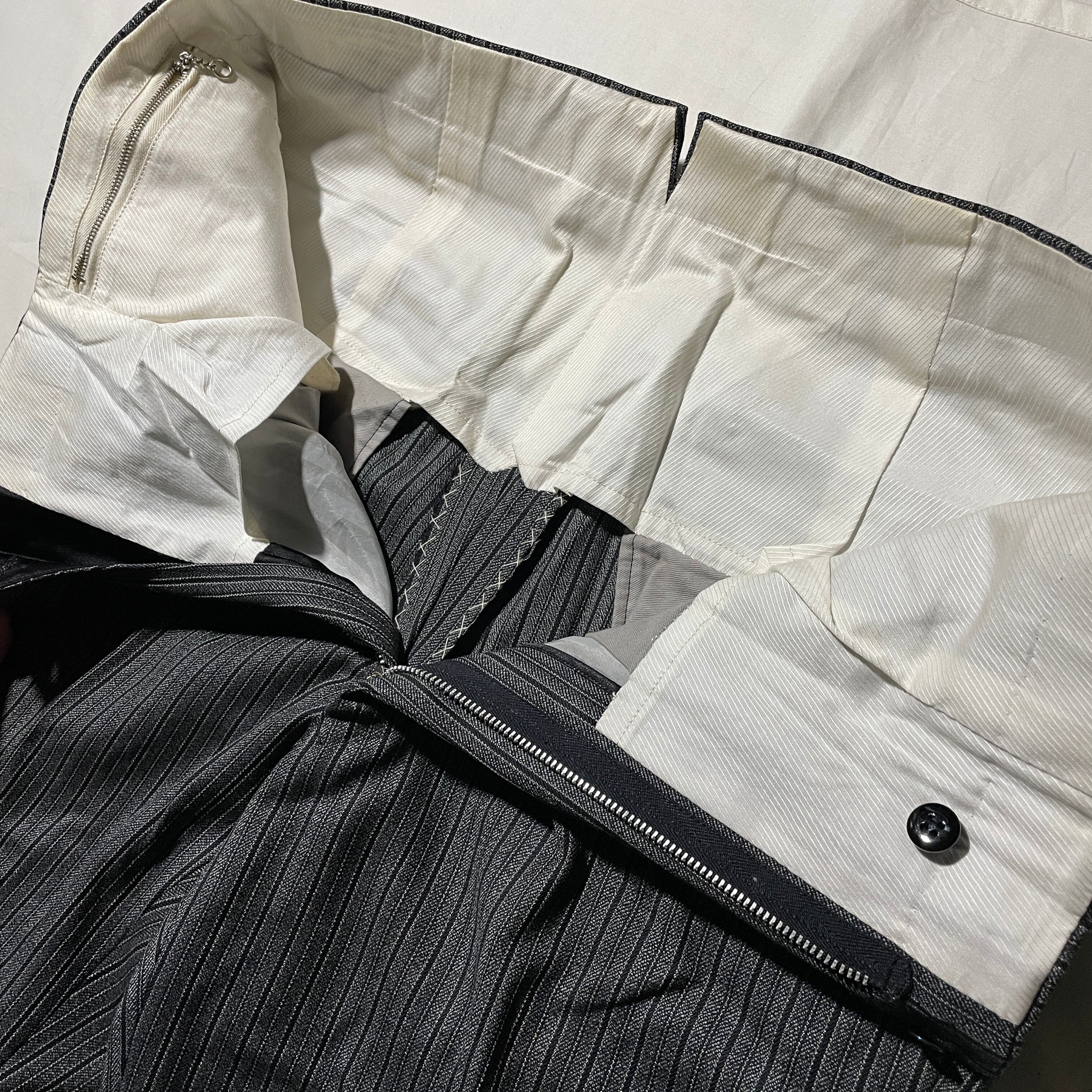 ウエストバックの割れやフロントポケットの位置、ベルトループなどアメリカ製のヴィンテージスラックス感もあり、縦ストライプパターンに綺麗なシルエットはユーロ圏のヴィンテージスラックスにも見えます。