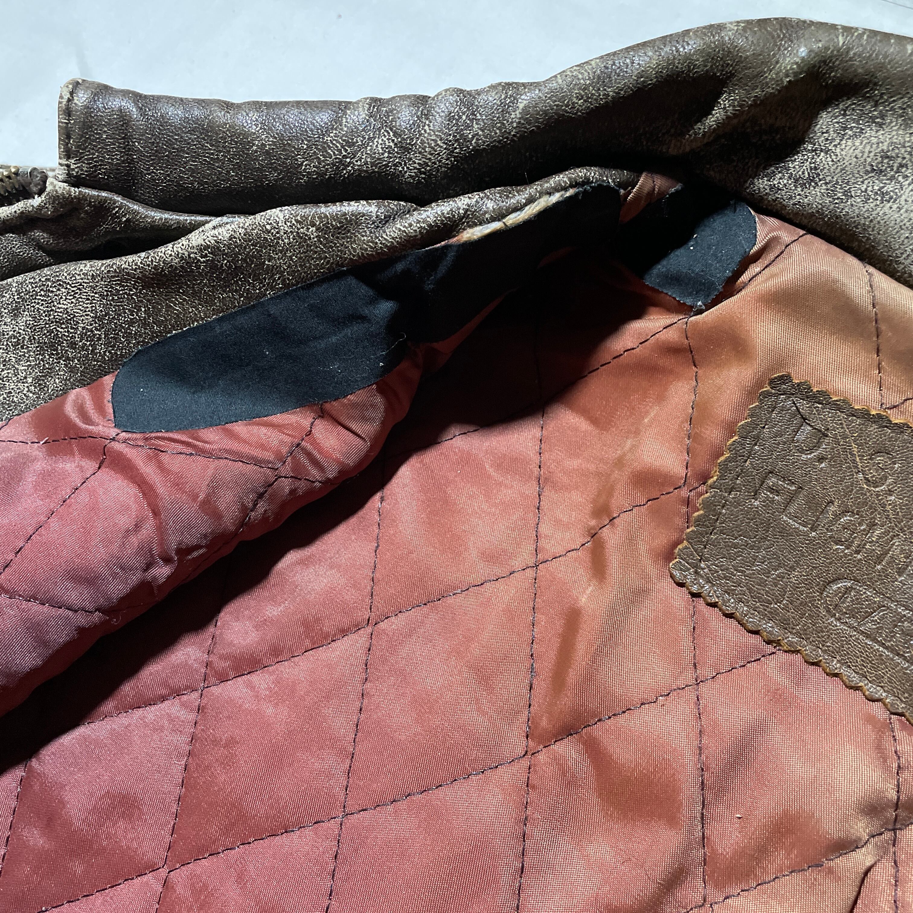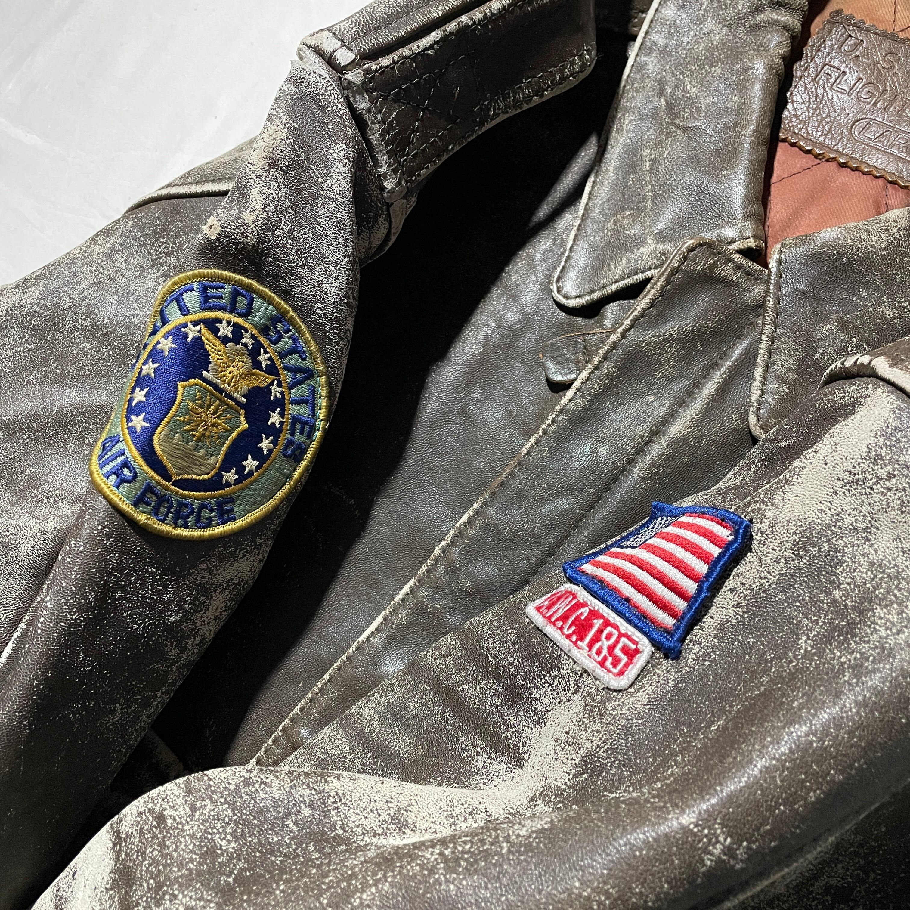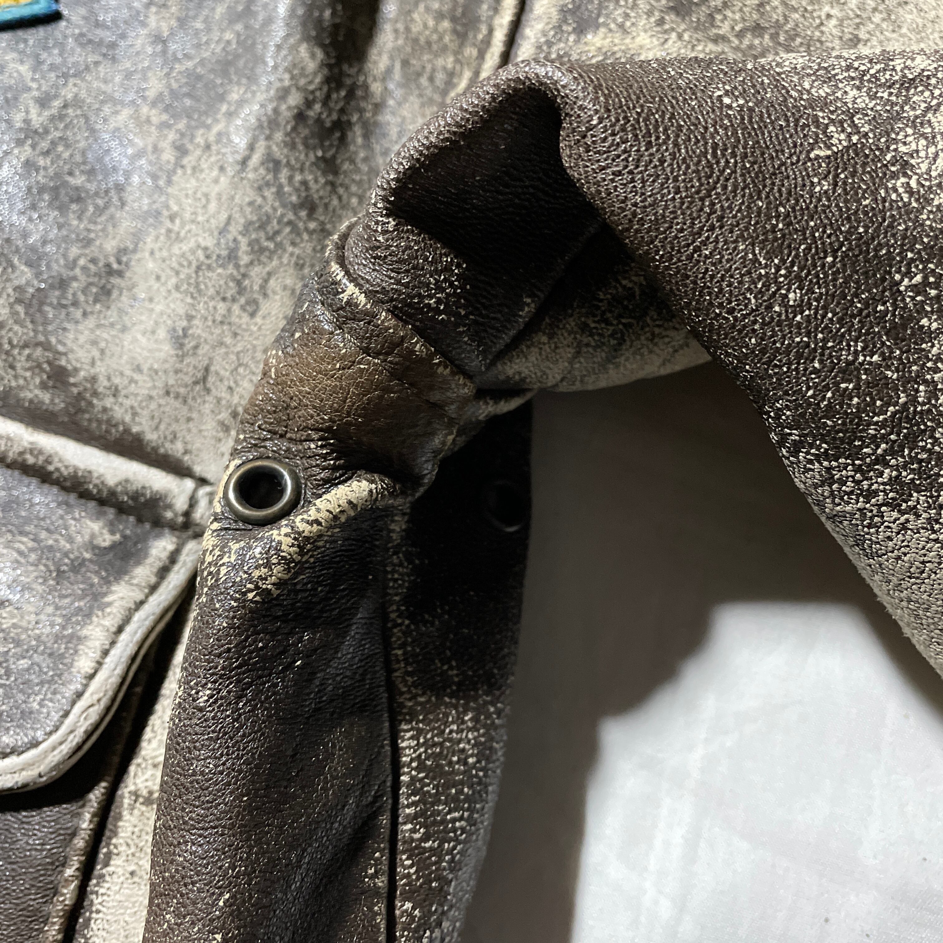 オリジナルのA-2では出せないような表面の革が所々擦れてできたあたりが絶妙に良い雰囲気を出してます。ワッペンは恐らく前オーナーのカスタム。