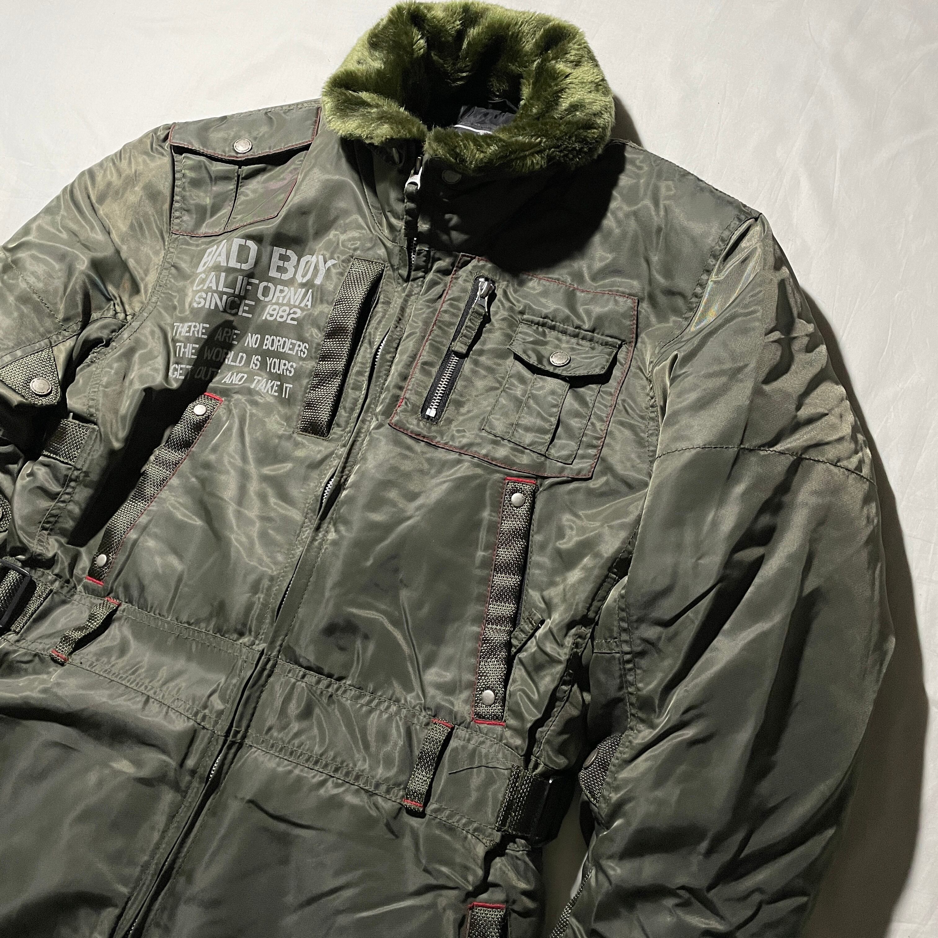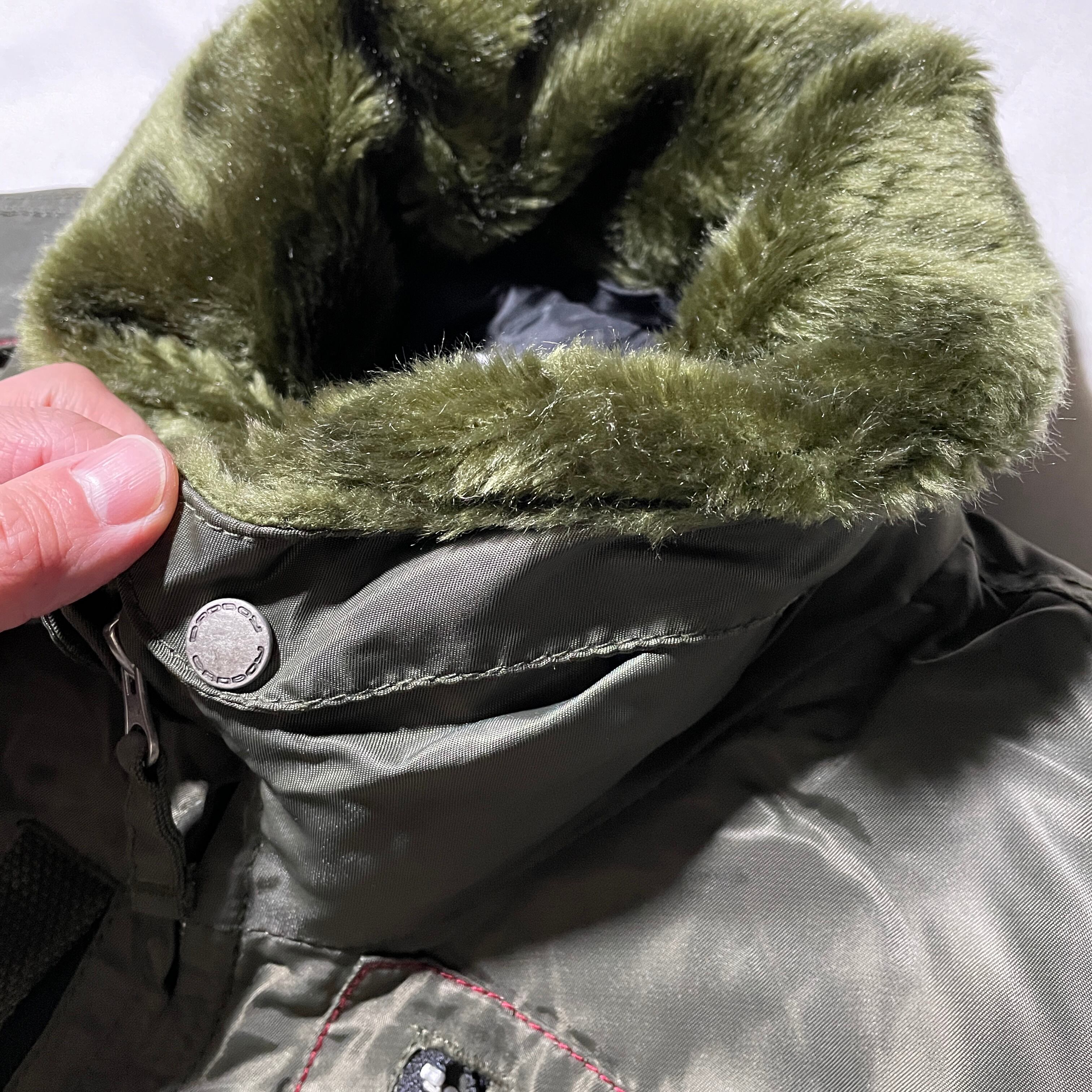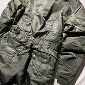 USミリタリーのフライトスーツを踏襲した無骨ながら機能性溢れる一着になっています。襟のボアは着脱可能、腰や太ももにはサイズを調整できるベルクロ付きです。ジップやポケットも沢山付いておりハイテク感も満載です。