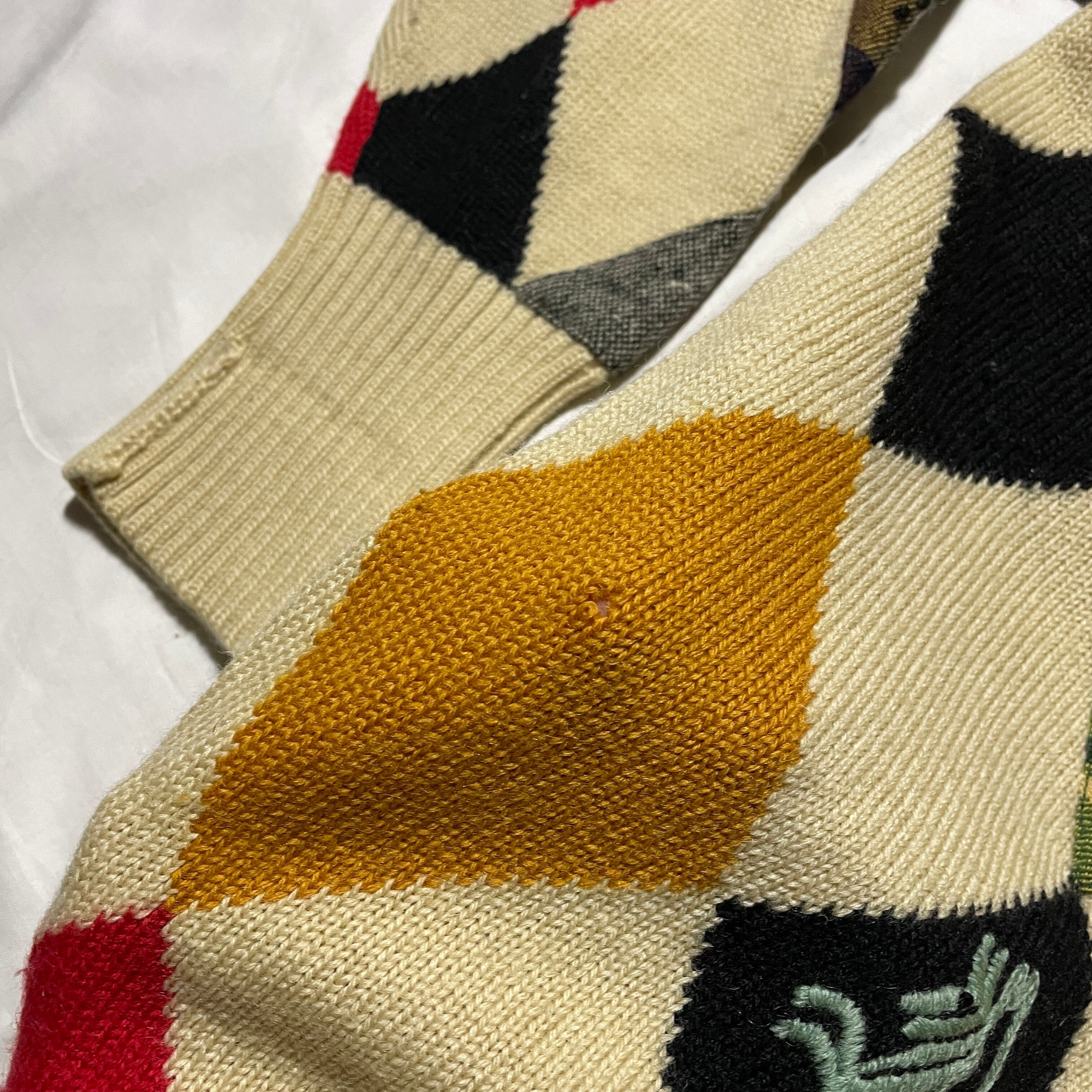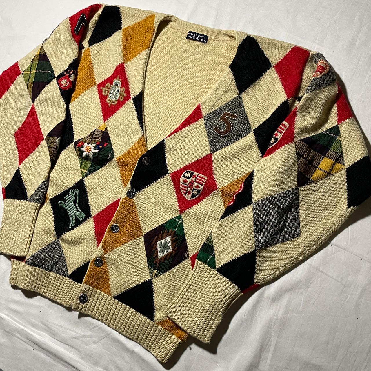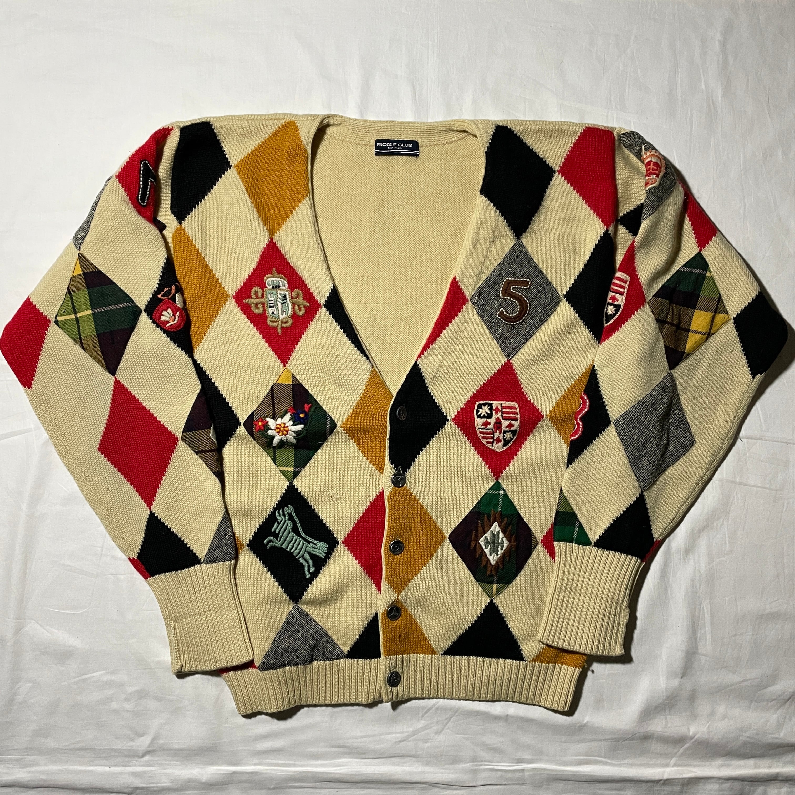 80s頃のNICOLE CLUB。アーガイルパターンをツイードやチェックパターンのパッチを使って表現した手の込んだ一着です。
