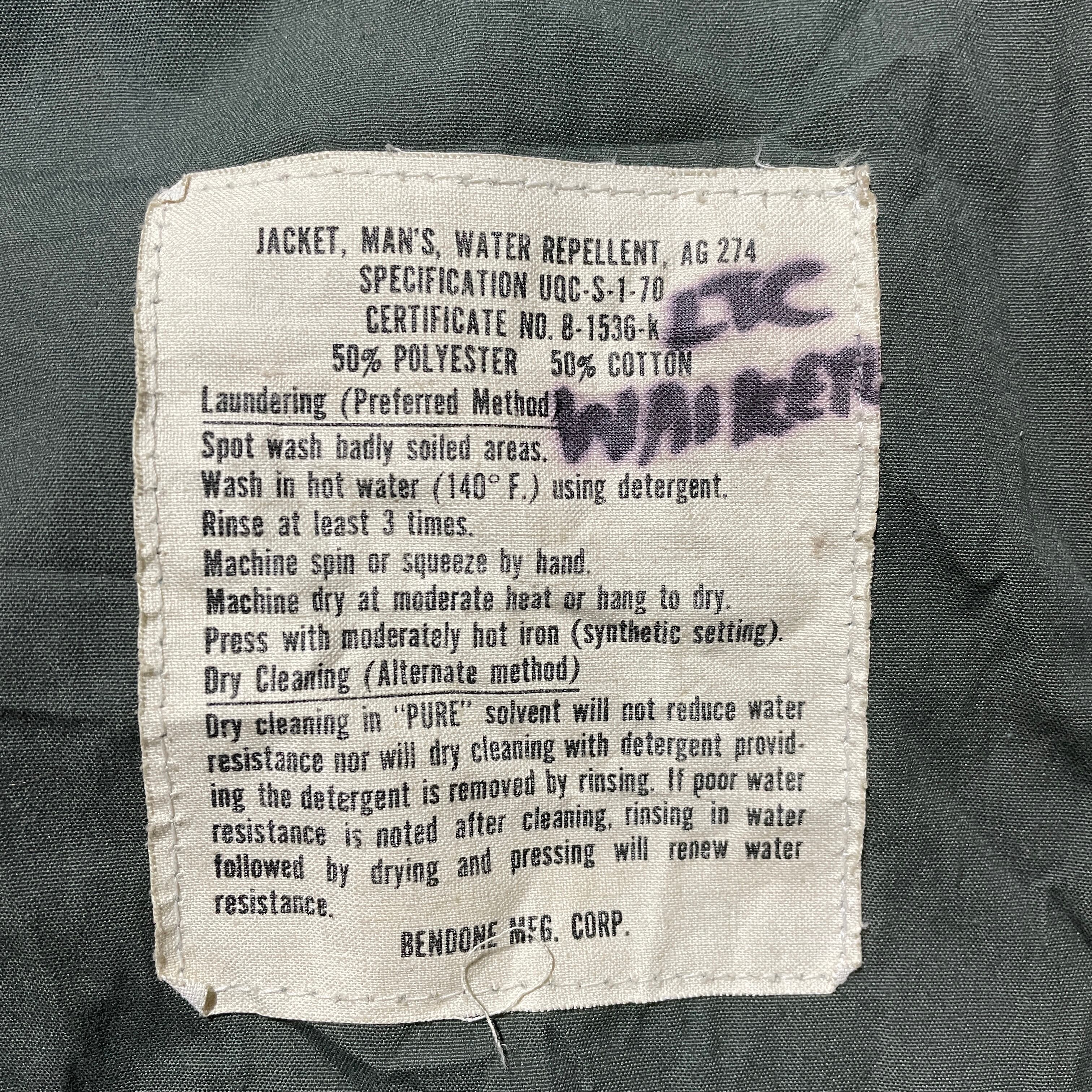 60s-70s初期頃のAG274ジャケット。ベトナム戦争時に採用されていたジャケットでシャリ感のあるコットン×ポリ地でWater repellent【撥水】機能付き。