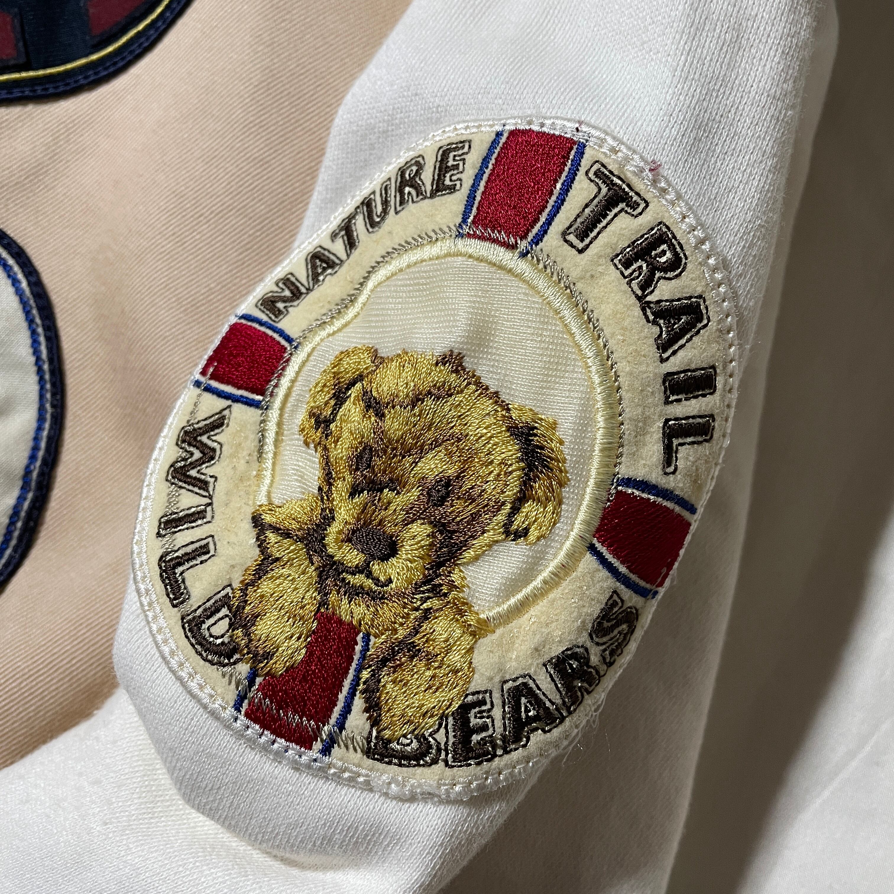 ピンク側、熊のワッペン部分の白の塗料が全て剥がれてます。全て剥がれているのでデザイン的には着用していて問題無いと思います。袖-脇あたりにかけてやや汚れあり。古着慣れされていれば問題無く着用可能なコンディションです。