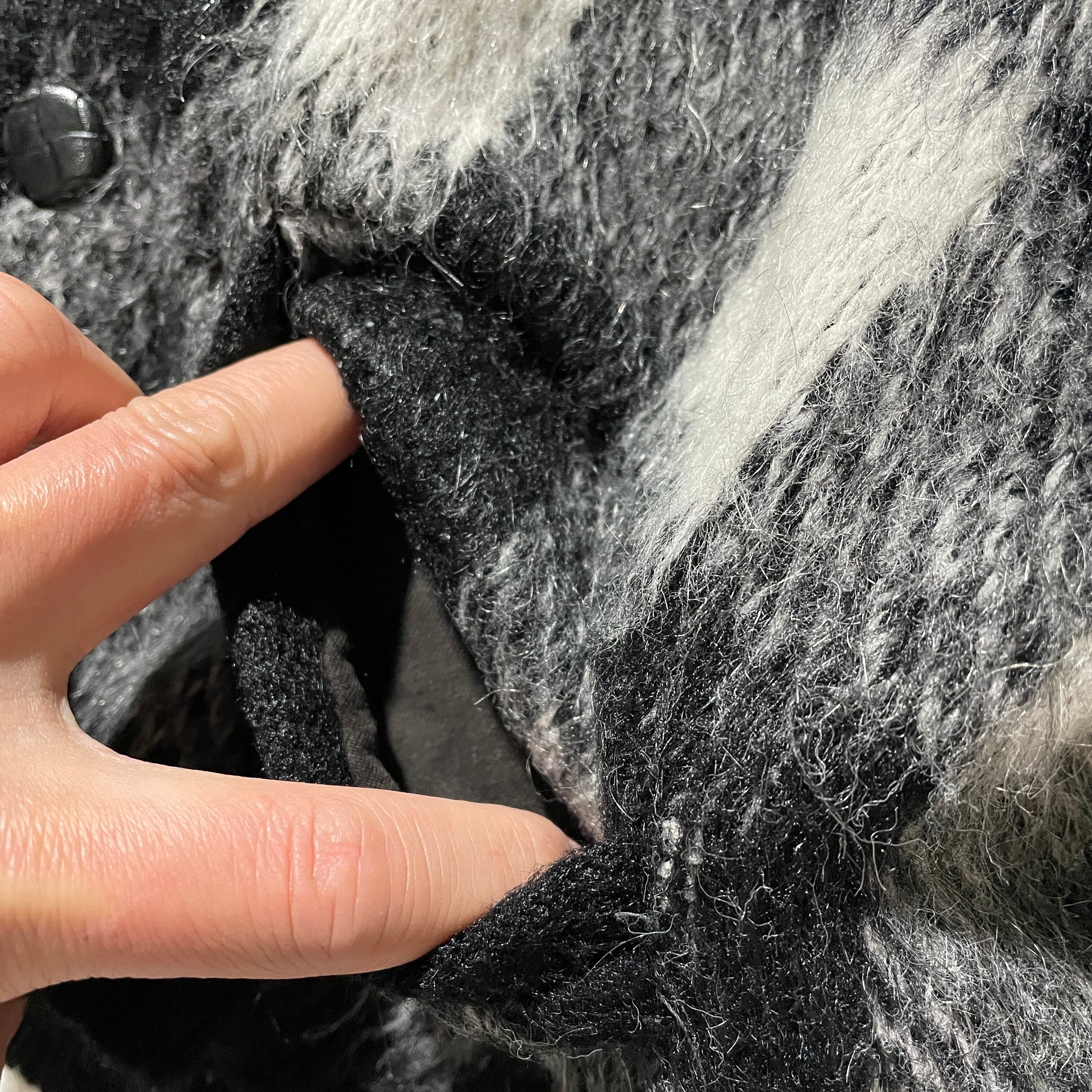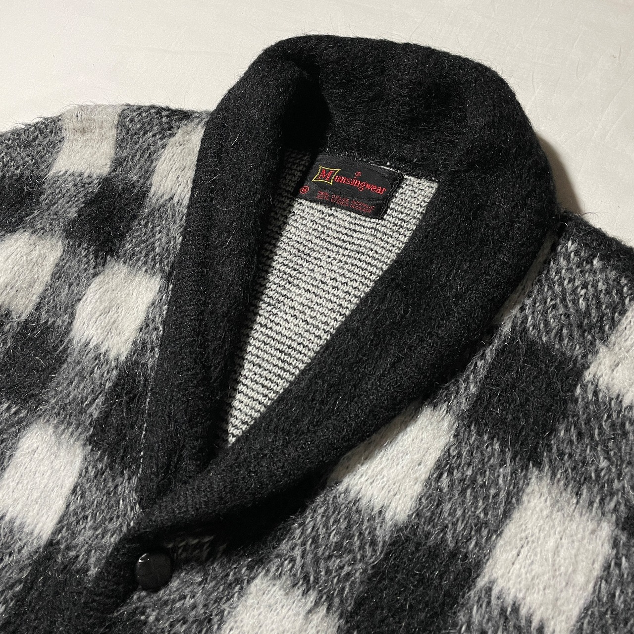 60s頃のMunsingwear。ブラック×ホワイトのブロックチェックパターンにショールカラーのモヘアカーディガン。そうそうお目にかかれるアイテムでは無いと思います。