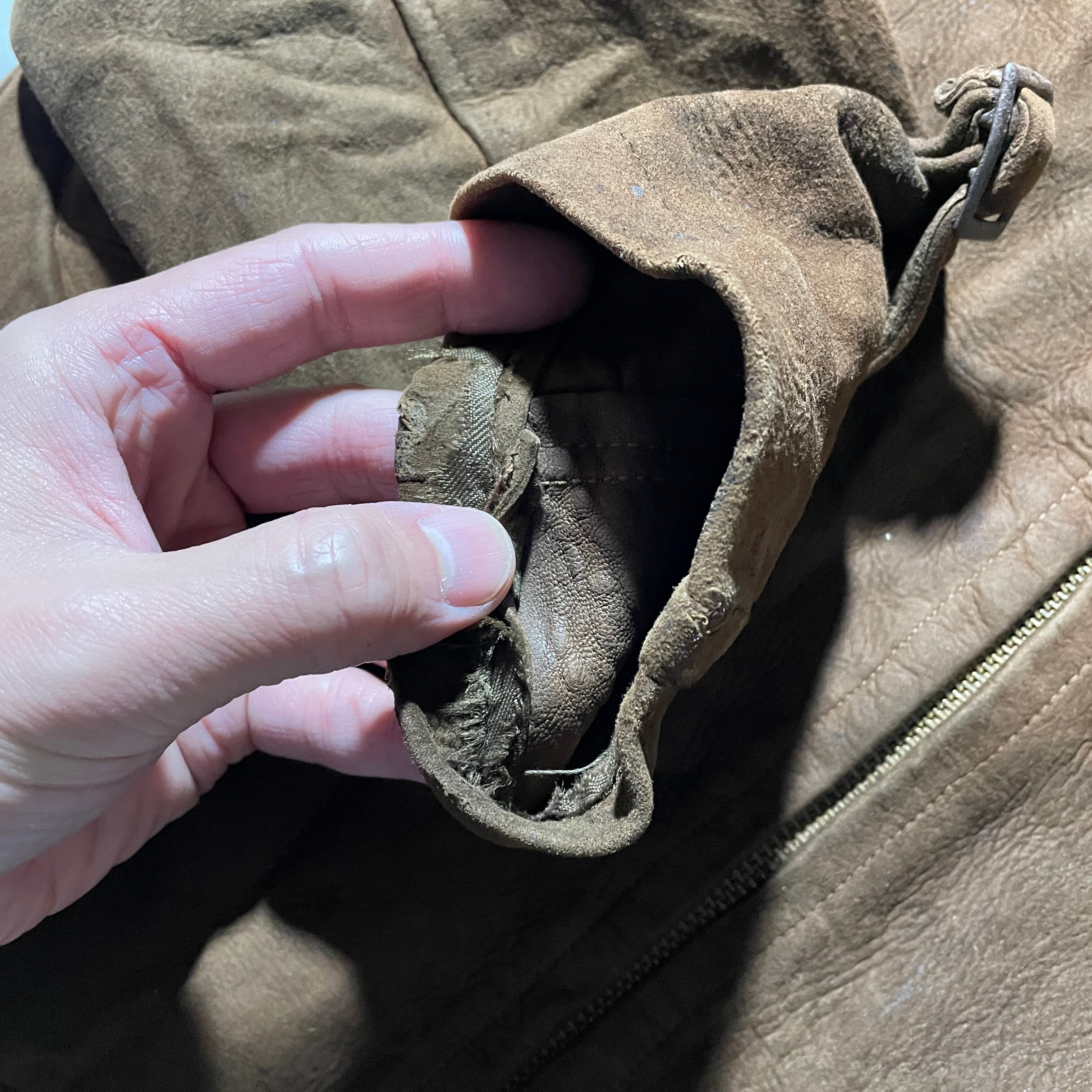 40s頃のヌバックディアスキンを使用したスポーツジャケット。ロングポイントの襟にコの字留めジップに鳩目などヴィンテージディテール満載の一着です。