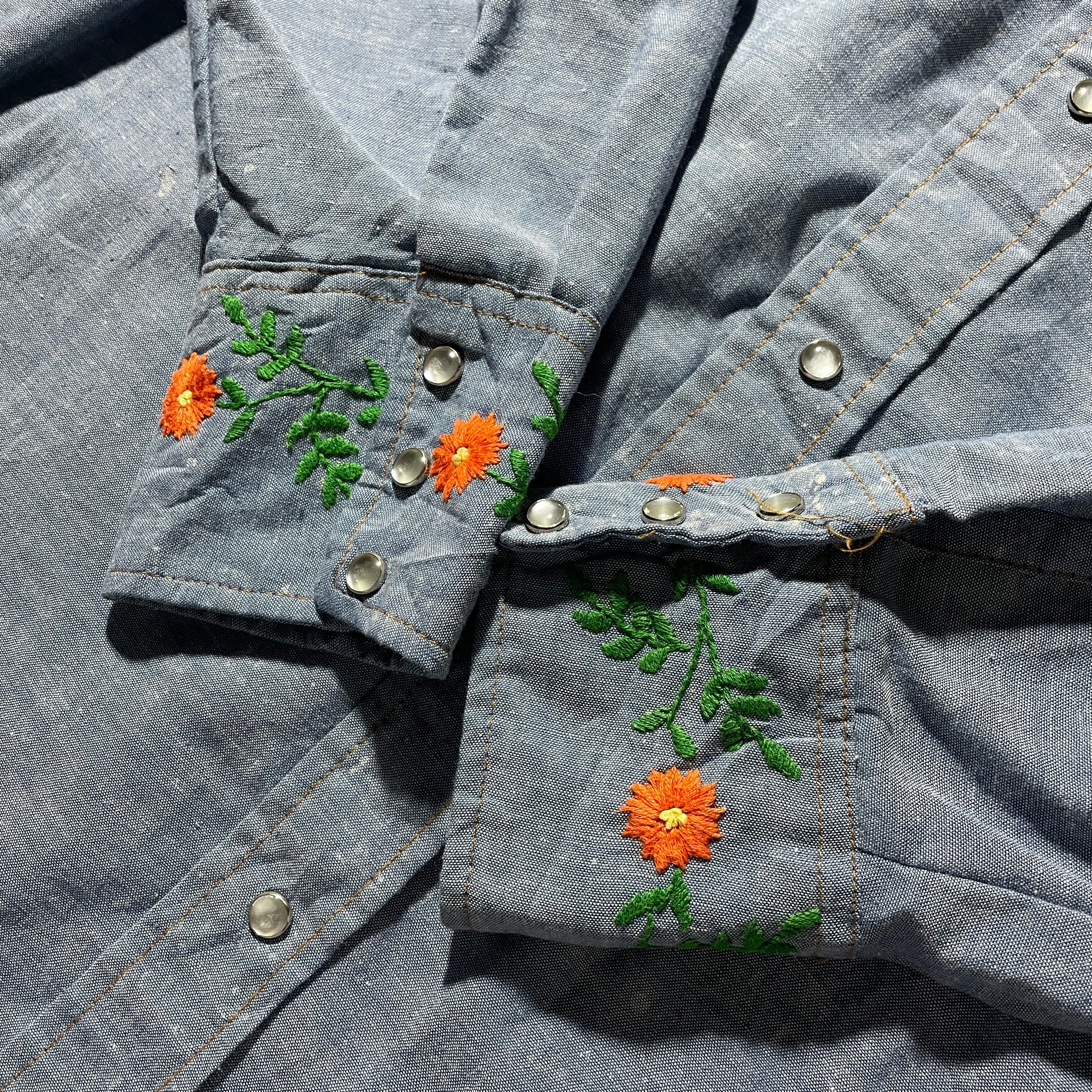 7当時のヒッピームーブメントの香りが色濃く残る刺繍の入ったウエスタンシャツ。70s頃のアイテムでよく見かけるコットン×ポリエステルのシャンブレー地です。