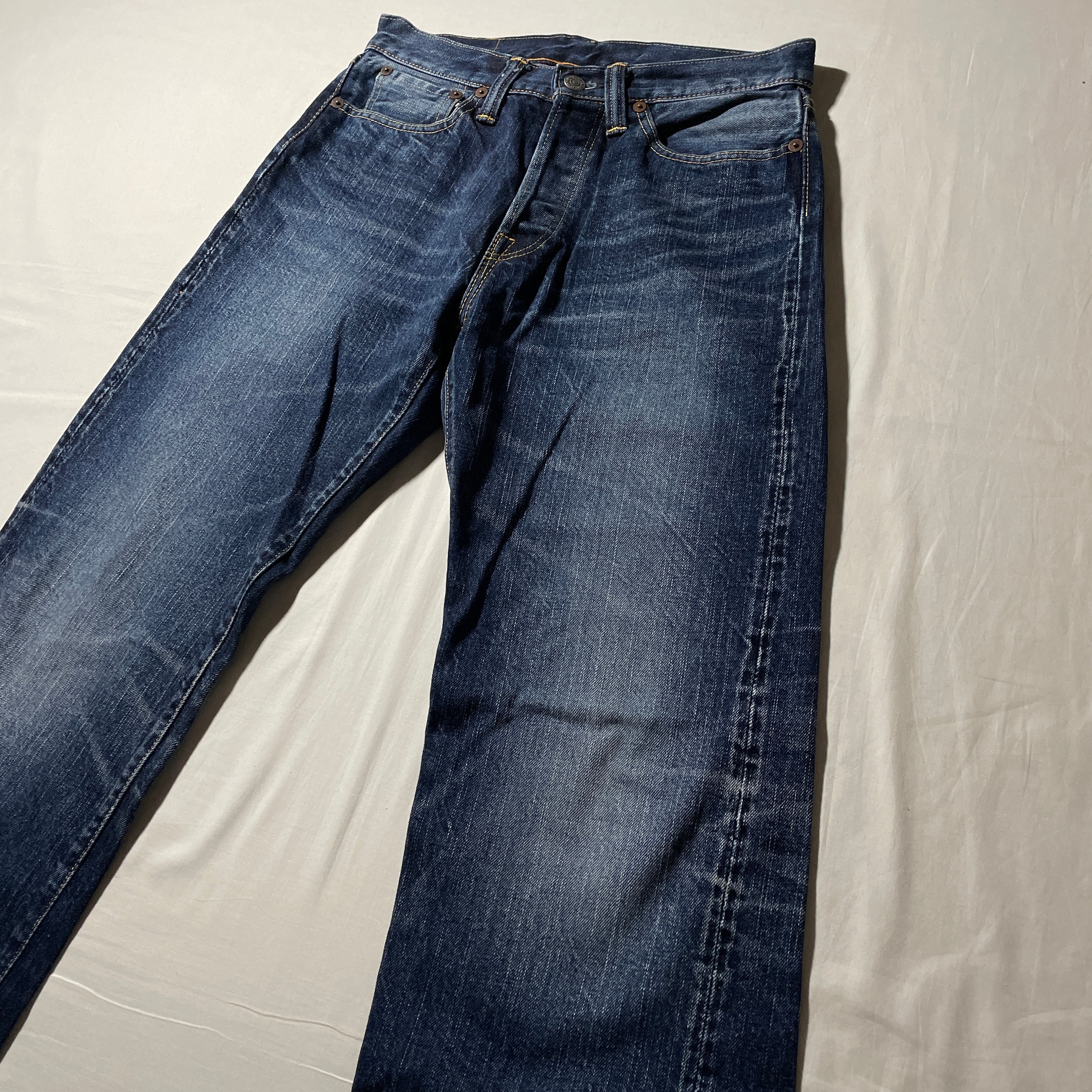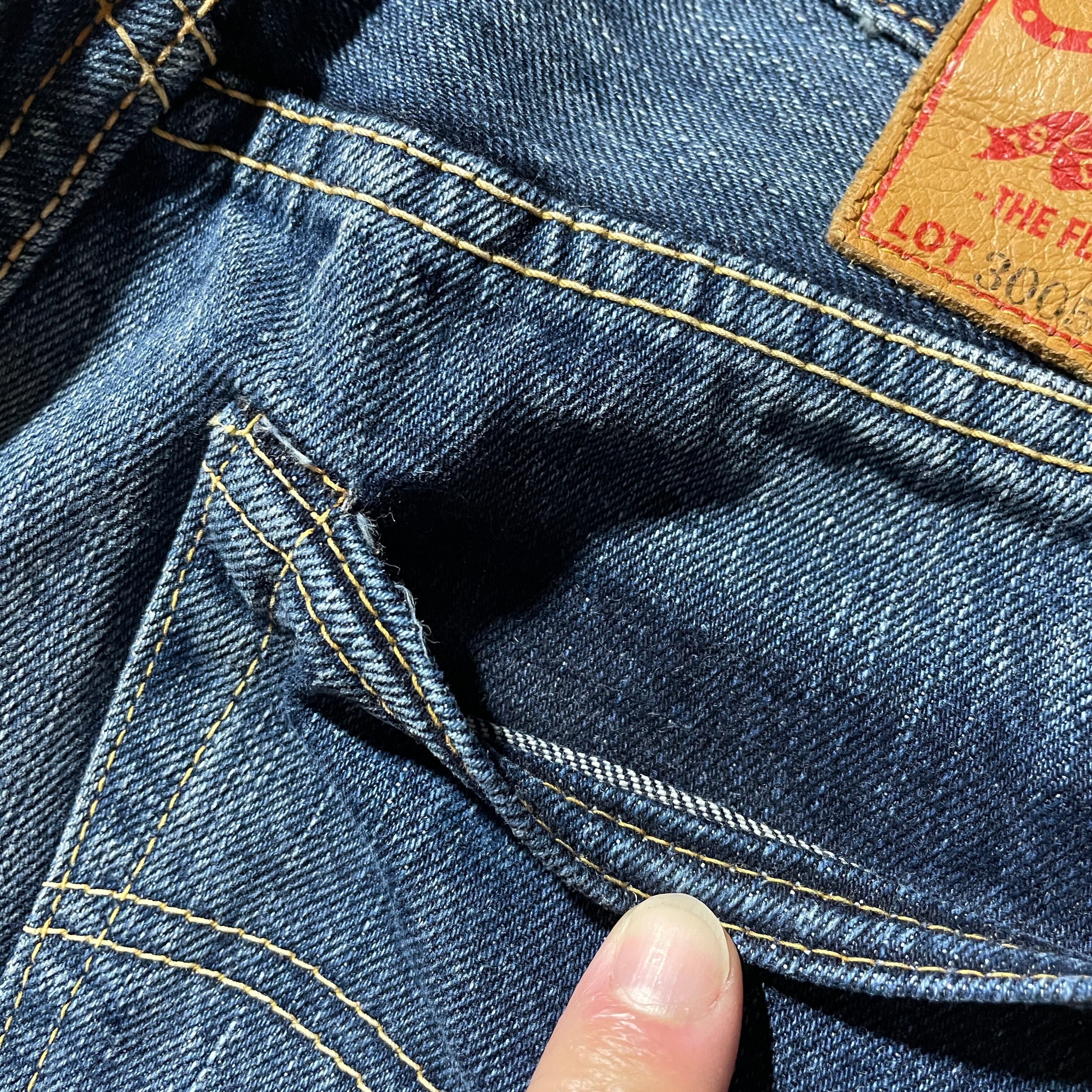 THE FLAT HEADの3005SPC。デニムのお手本のような綺麗な縦落ちにヒゲ、ハチノスが入るヴィンテージと見紛うハイクオリティな一着に仕上がってます。