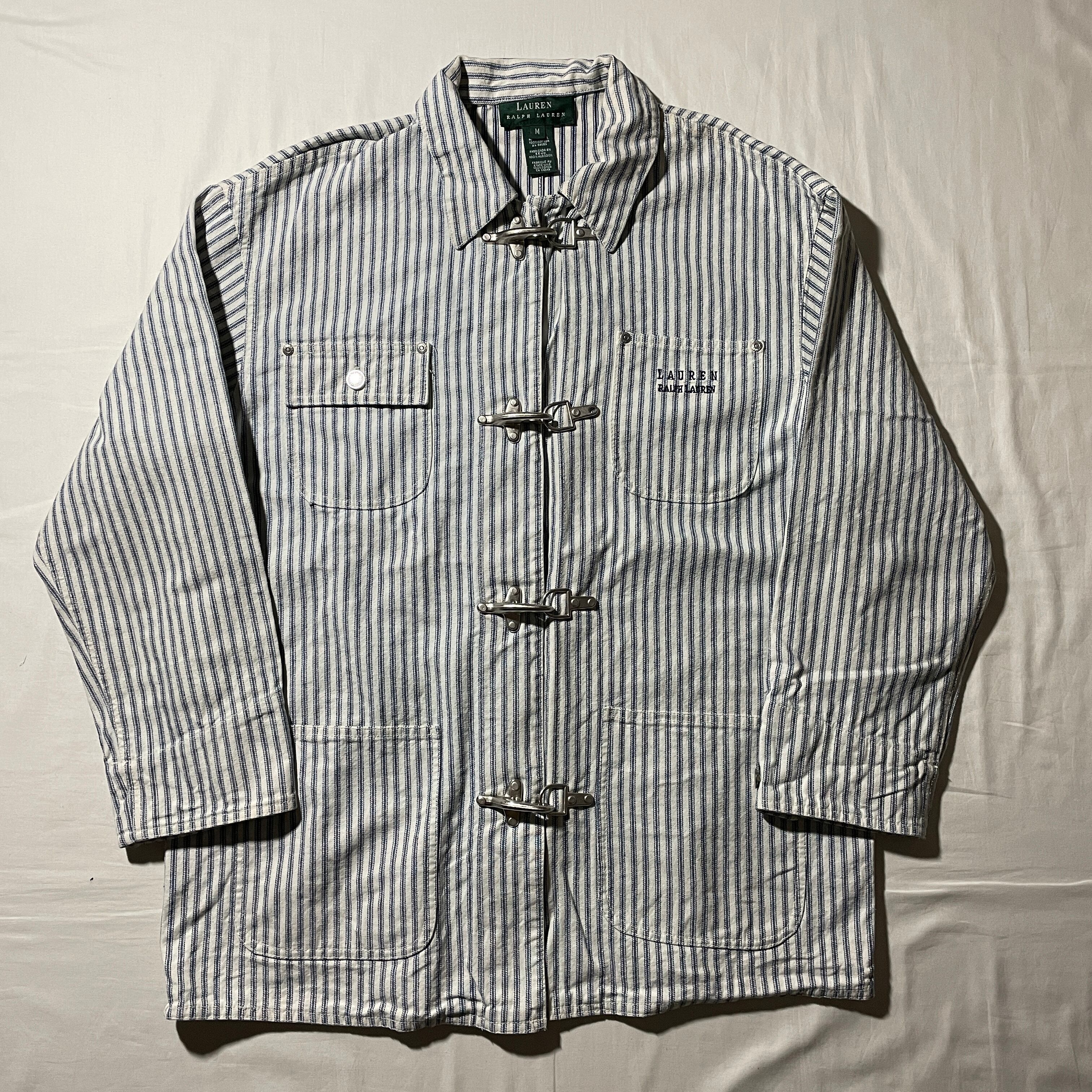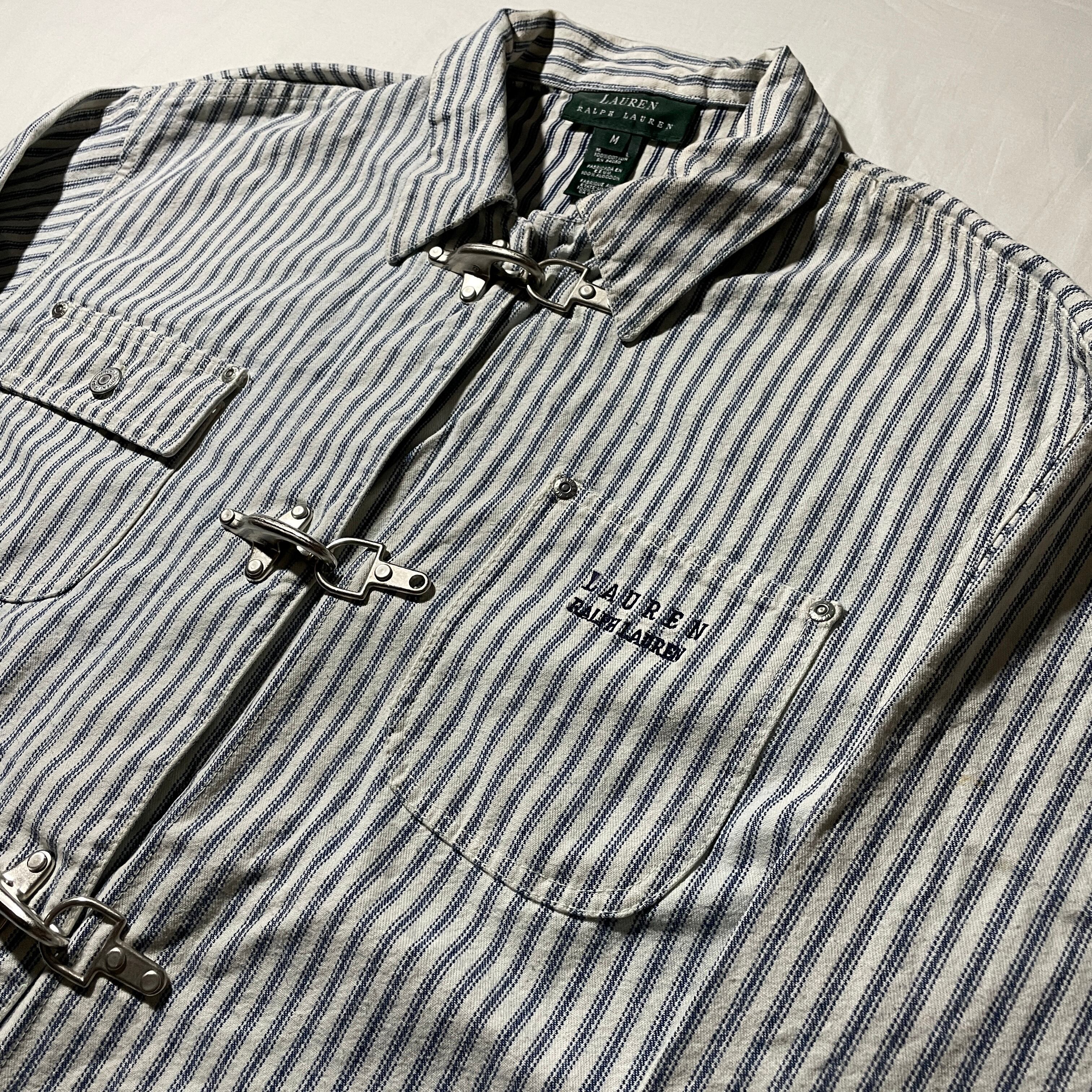 90s頃のLAUREN RALPH LAUREN。ヒッコリーデニム生地のカバーオールとファイヤーマンジャケットを足したような良いとこ取りデザインです。