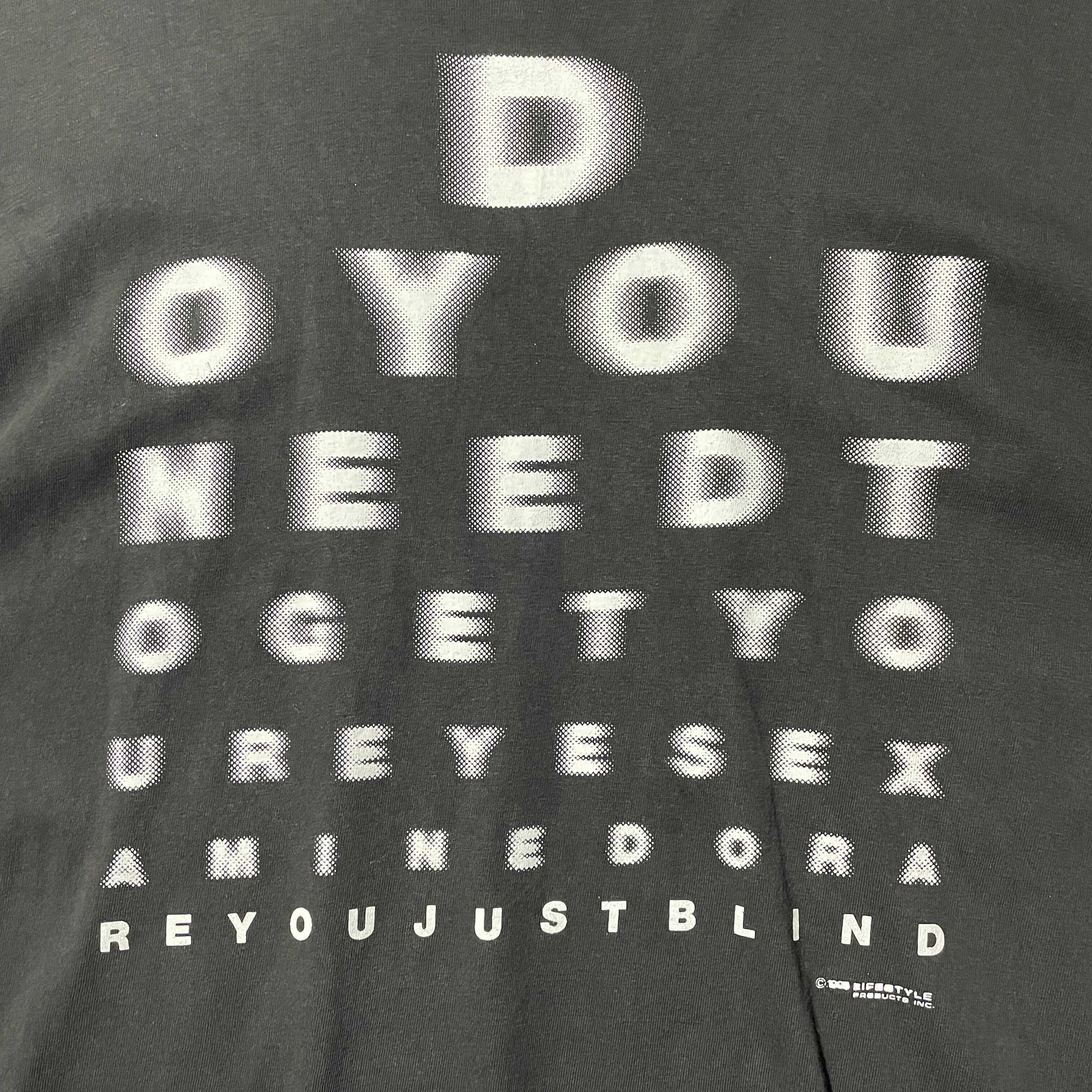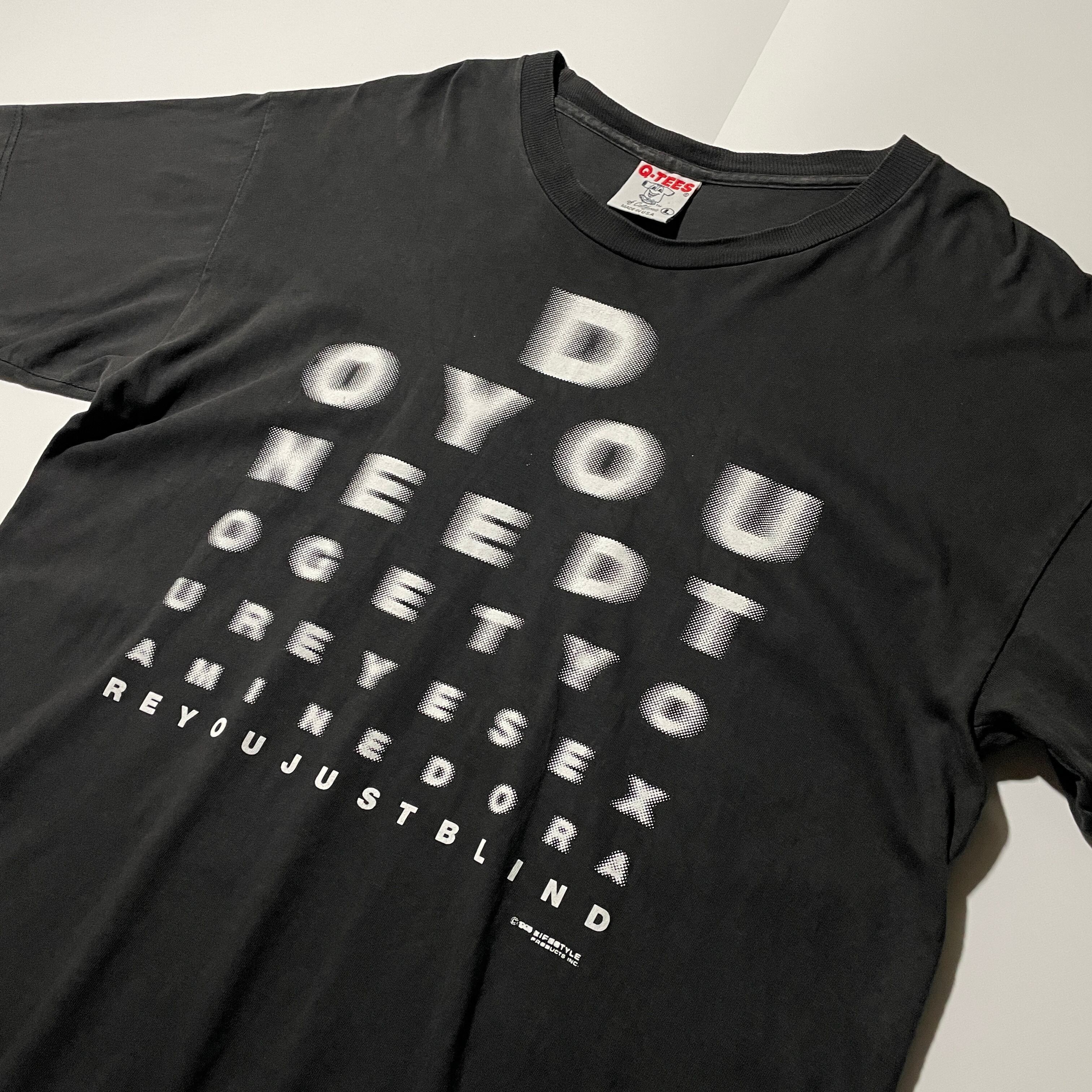 95sのコピーライト入り。フロントに入るアルファベットの羅列はDo you need to get your eyes examined or are you just blind. 眼科行く必要があるかもしくは盲目か、、これ読んだなら眼科行けよって感じの意味かと思います。